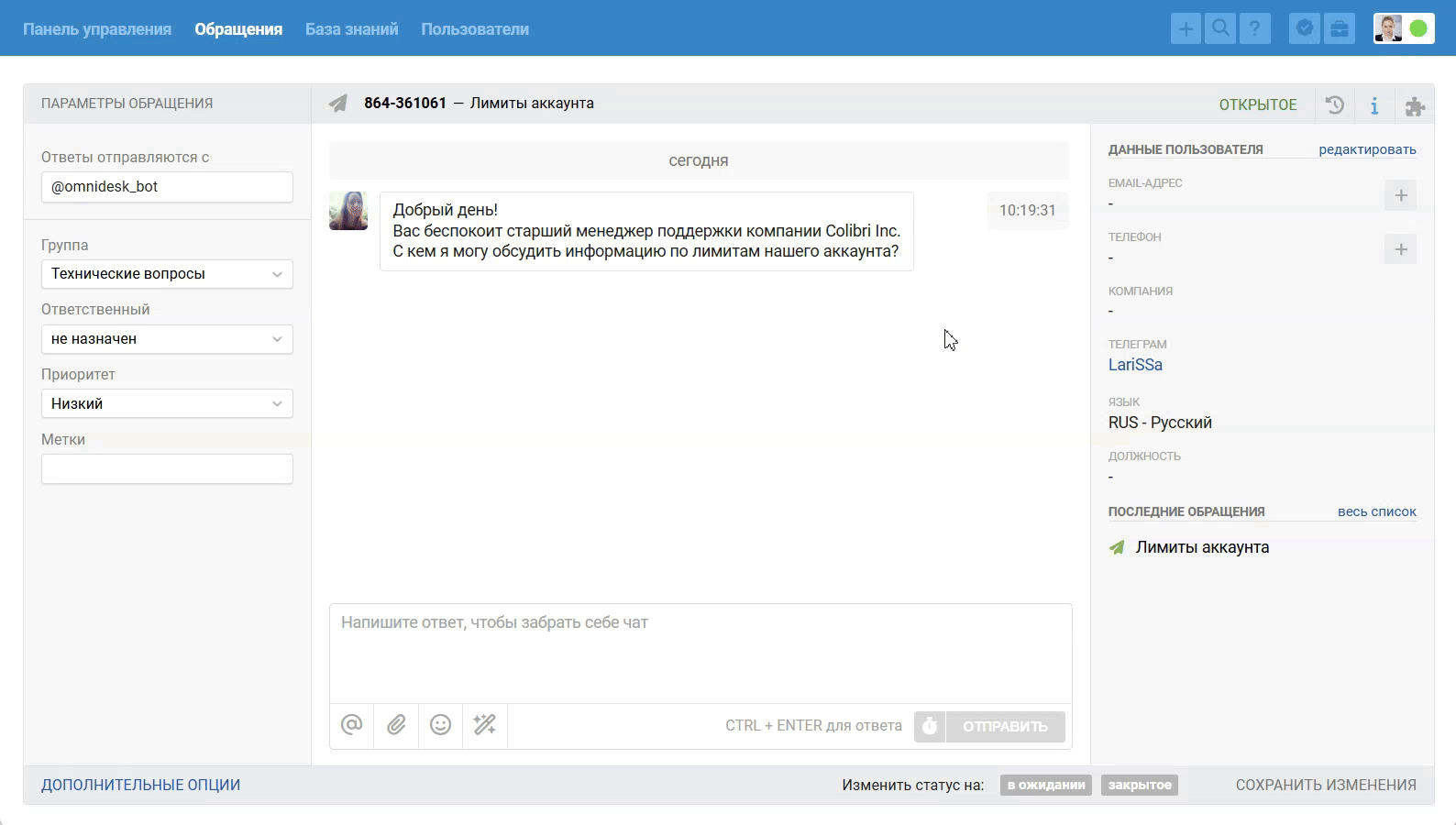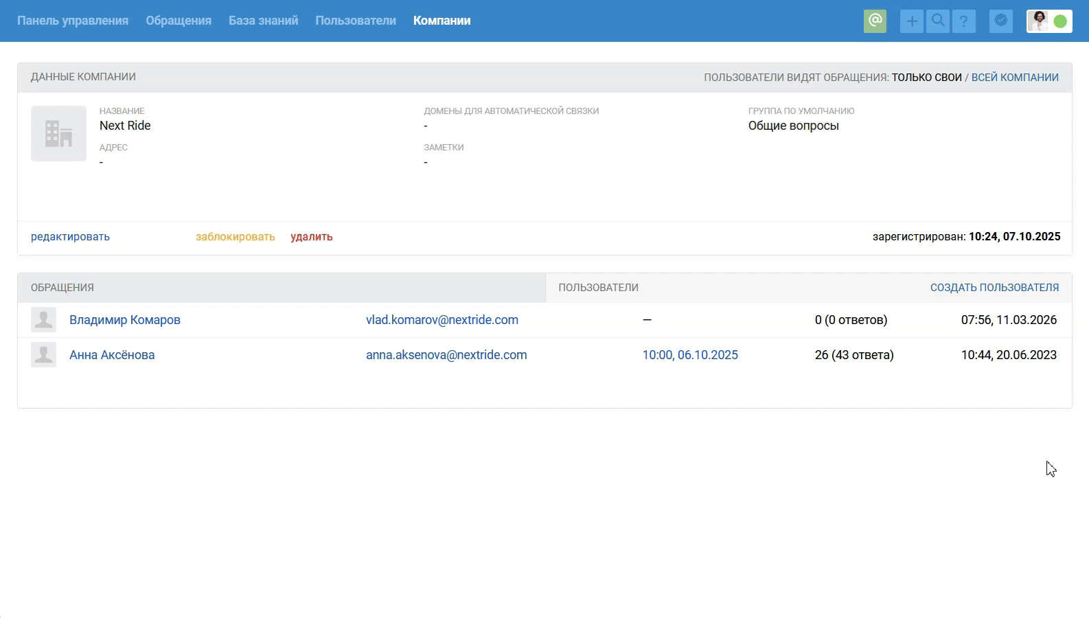Если в данных пользователя прописать компанию, создаётся её профиль, в котором собираются пользователи с такой же компанией и их обращения. Это помогает отслеживать частоту обращения сотрудников компании и дать некоторым из них возможность видеть все обращения компании.