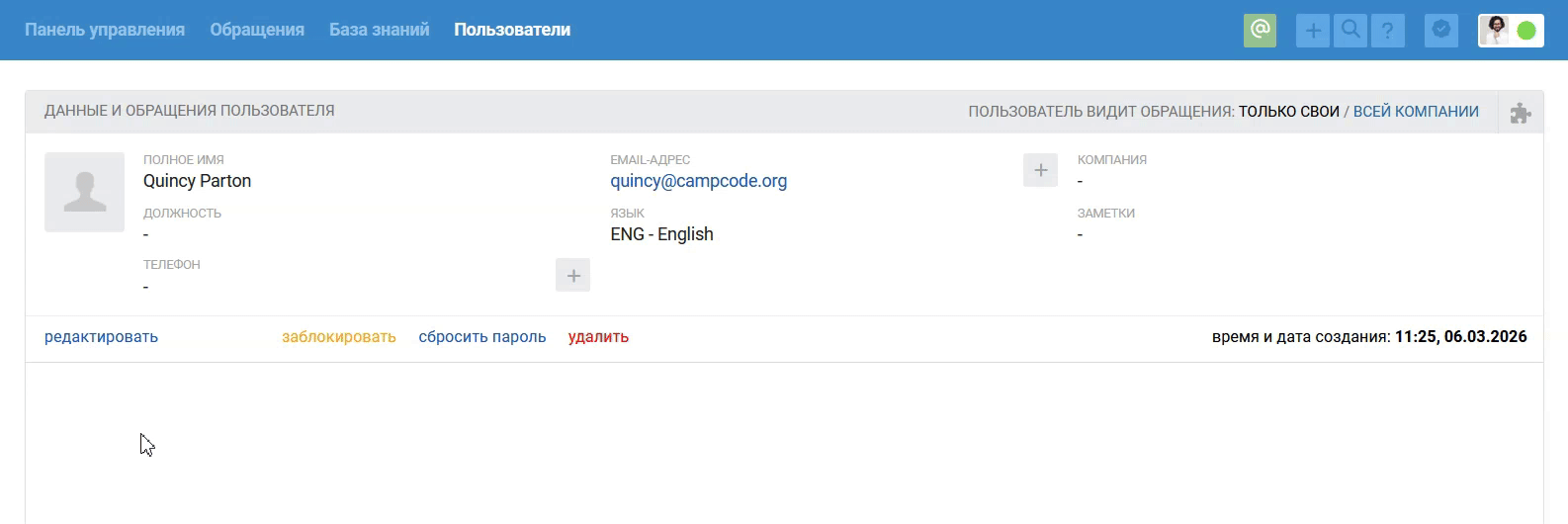 в) При просмотре пользователей компании в шапке списка есть ссылка «Создать пользователя» для быстрого добавления пользователя через модальное окно (по аналогии со ссылкой «добавить нового пользователя» на странице создания нового обращения).