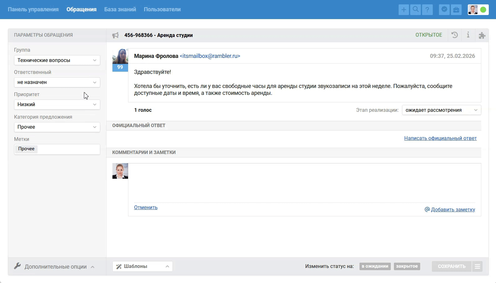 Если вы не хотите, чтобы пользователю отправилось уведомление о создании обращения, то выберите опцию «не отправлять письмо».