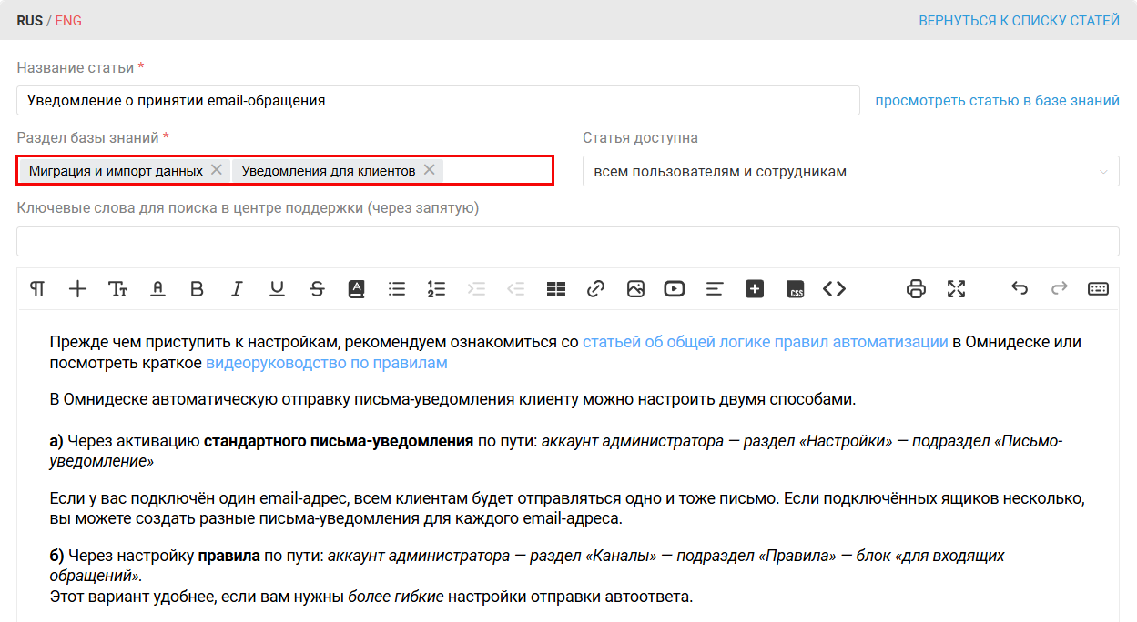 До сих пор чтобы разместить статью сразу в нескольких разделах базы знаний, приходилось создавать одинаковые статьи для каждого из них. Такой вариант, конечно, неудобен. Поэтому мы добавили возможность размещать статью сразу в нескольких разделах.