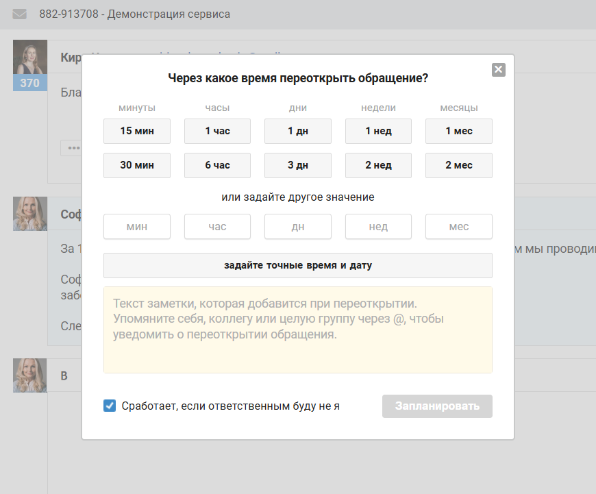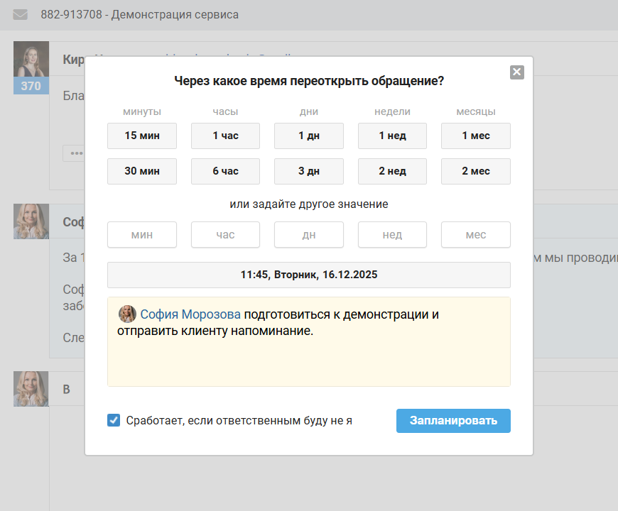 Функция переоткрытия обращений позволяет напомнить себе и коллегам о необходимых действиях.