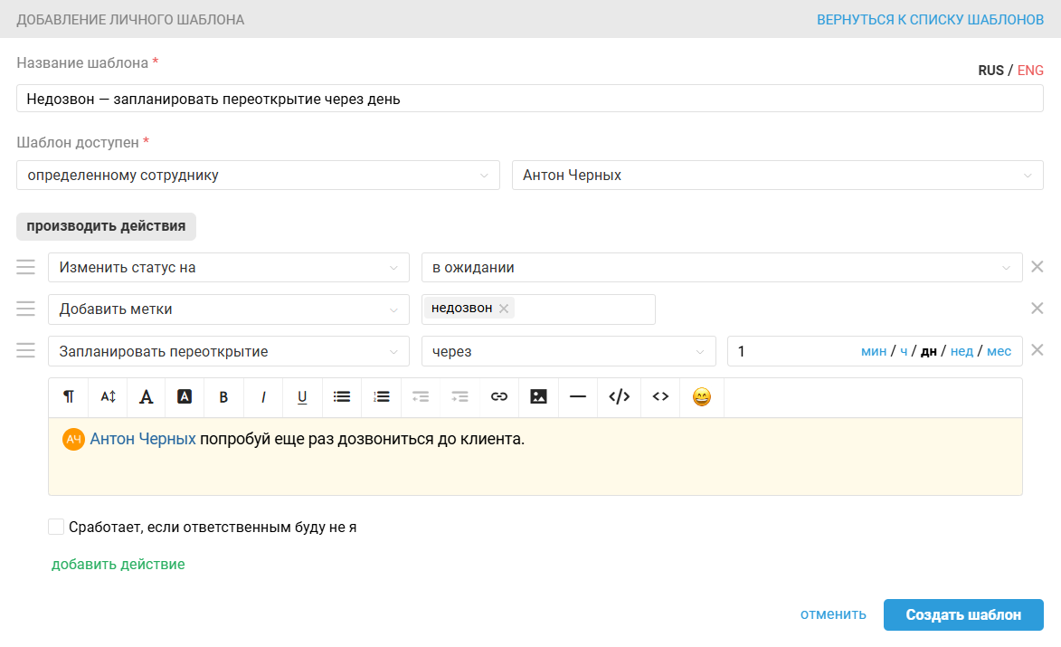 б. Планировать переоткрытие через шаблоны удобно в случае, когда сотрудники часто создают однотипные напоминания. С шаблонами они могут сократить свои действия в рамках обращения до двух кликов. Вот пример шаблона, который можно использовать в случае недозвона до клиента.