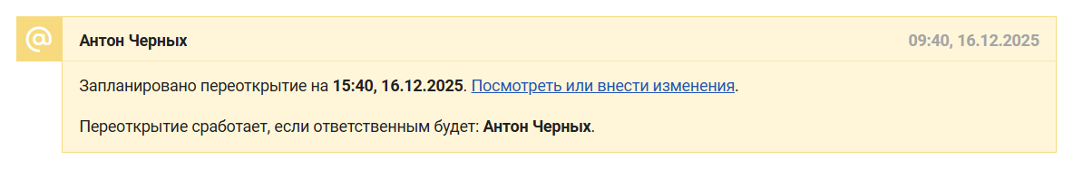 8) По истечении заданного времени обращение переоткрывается, и в нём появляется заметка о том, что это запланированное переоткрытие. В заметке также есть возможность отложить переоткрытие ещё на какой-то срок.