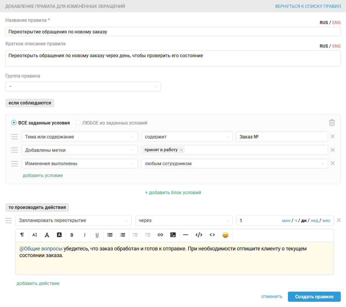 а. Правила позволяют полностью автоматизировать планирование переоткрытий. Например, с помощью правила для изменённых обращений можно напоминать сотрудникам о необходимости проверить состояние заказа.