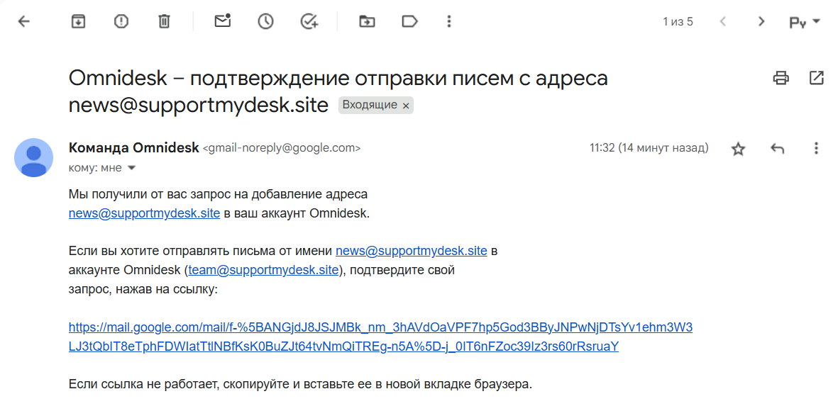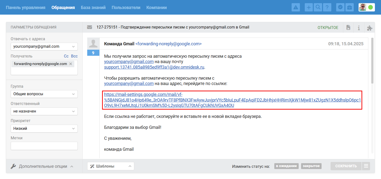 в. Перейдите в аккаунт сотрудника в Омнидеске, найдите письмо от [email protected] и подтвердите пересылку, пройдя по ссылке.