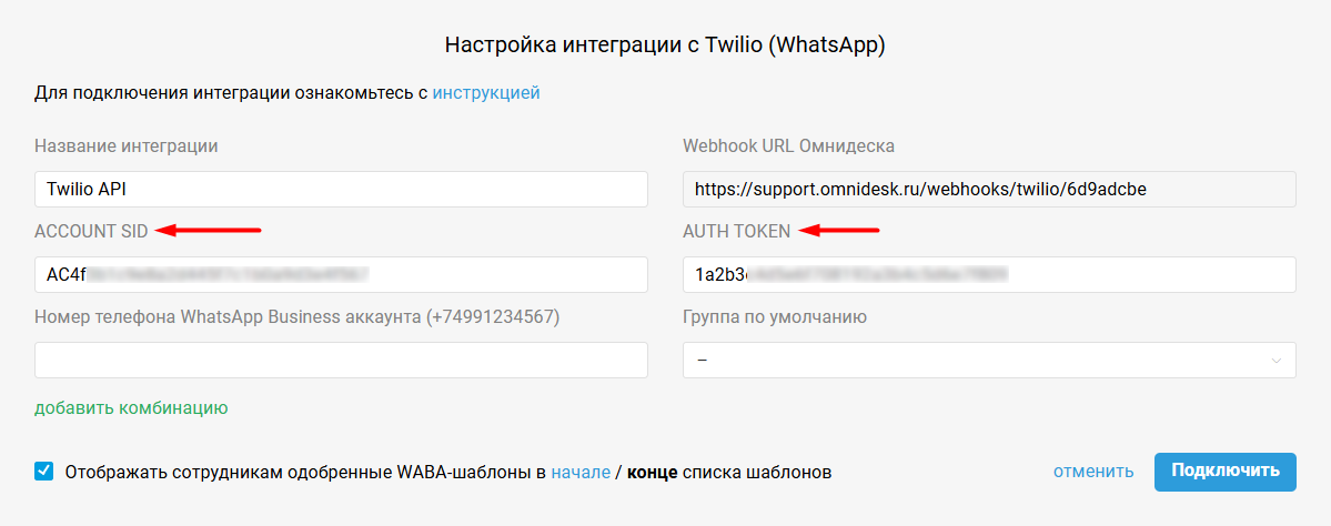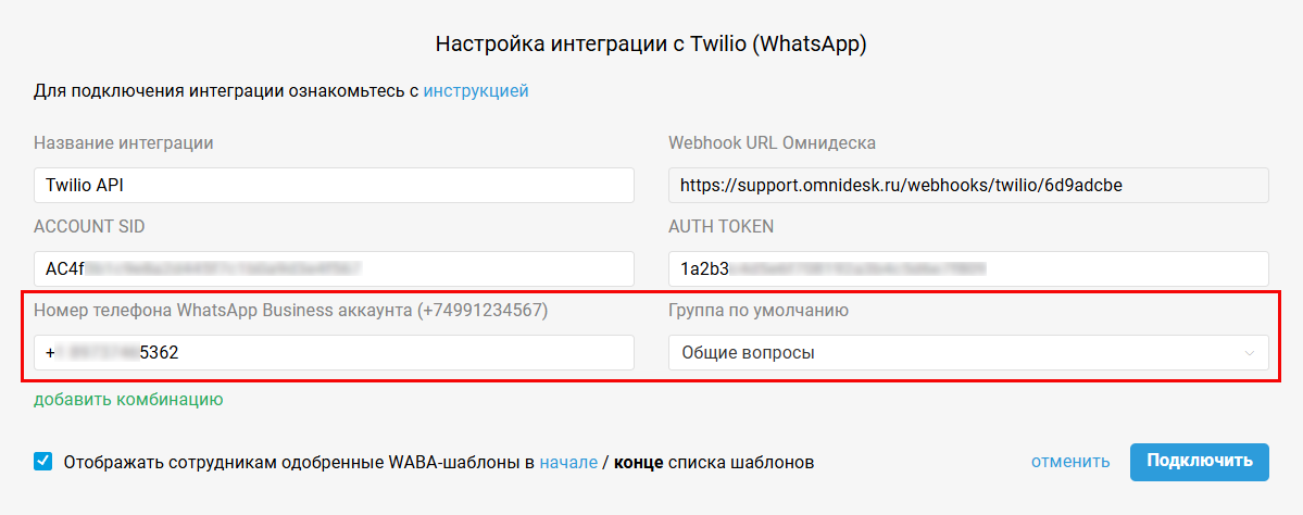 3. В форме подключения интеграции в Омнидеске укажите номер телефона, настроенный в Twilio как WhatsApp Sender, выберите группу по умолчанию, в которую будут поступать обращения с этого номера, и нажмите кнопку «Подключить».