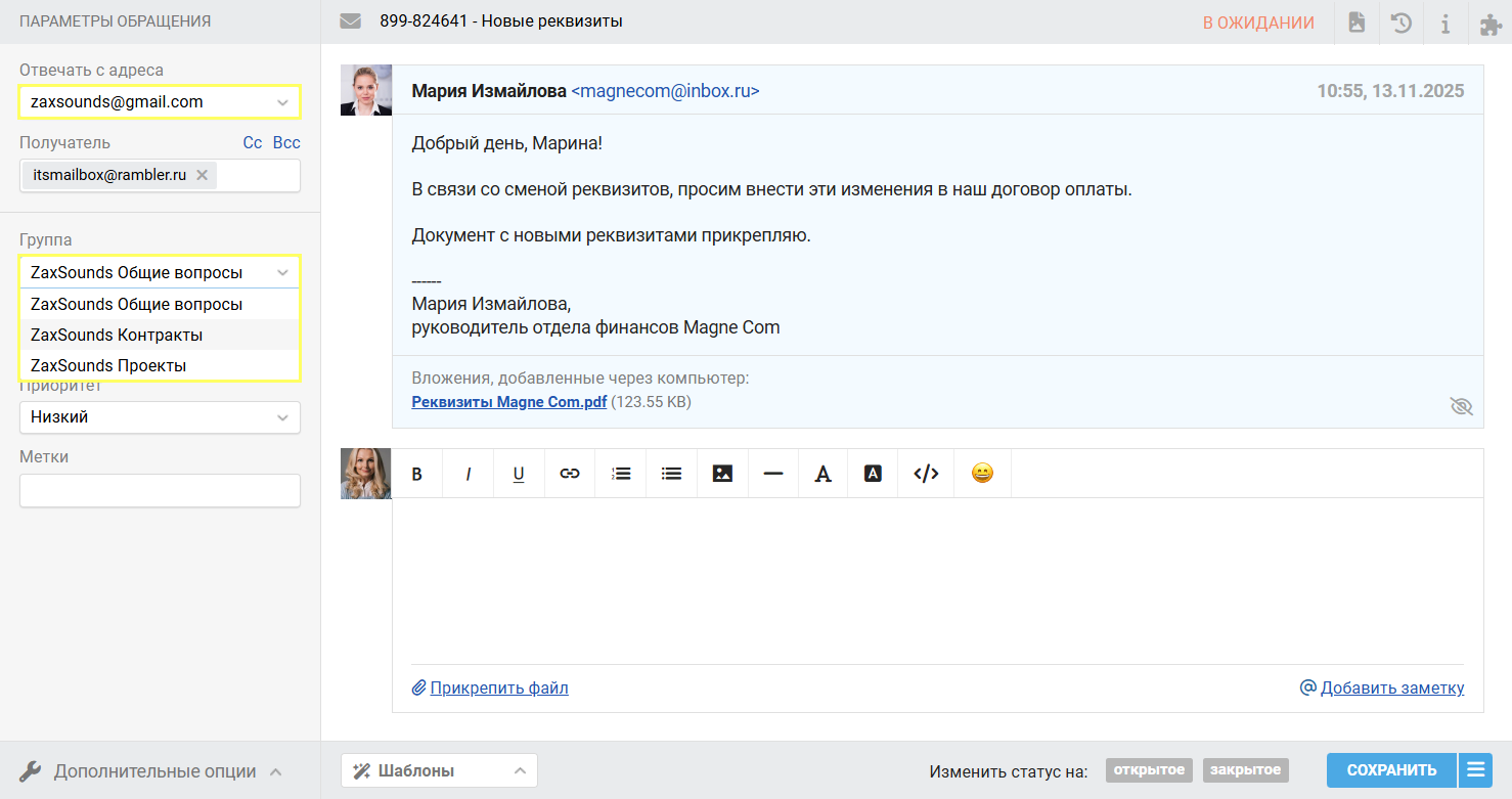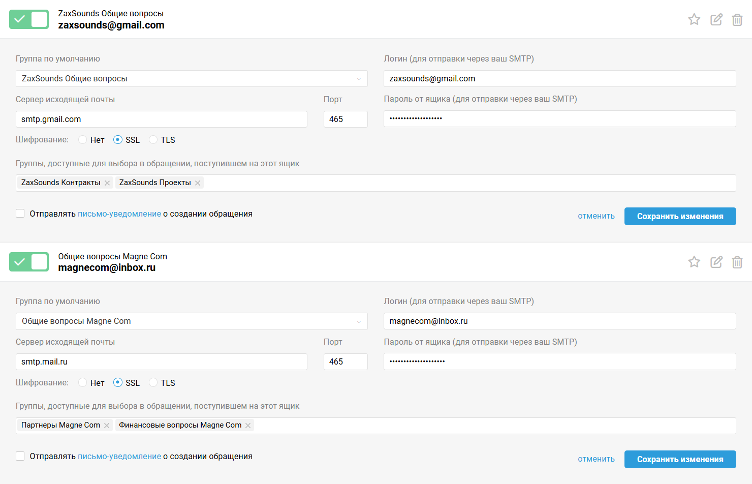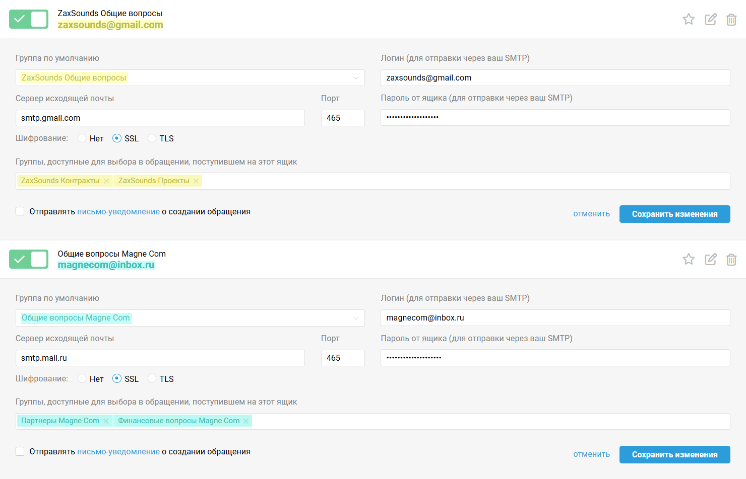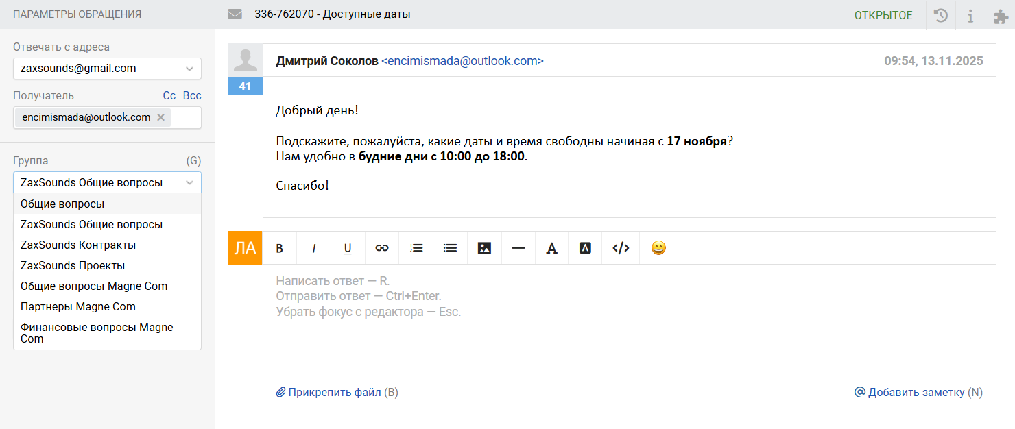 3. Когда в настройках ящиков указаны определённые группы, мы всегда проверяем соответствие выставленных ящика и группы на странице обращения и на странице создания обращения.