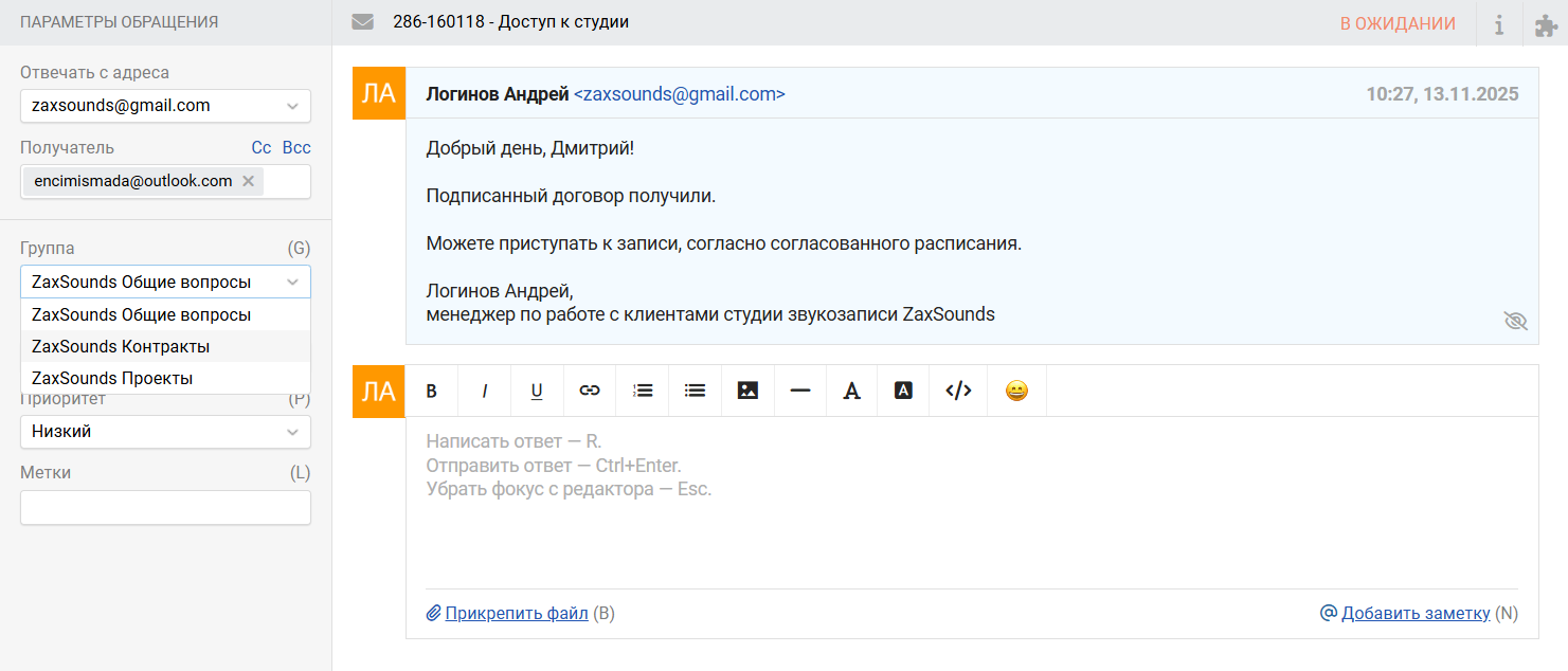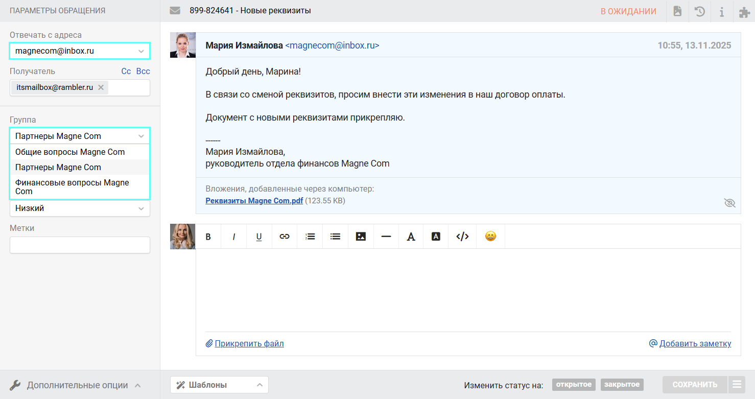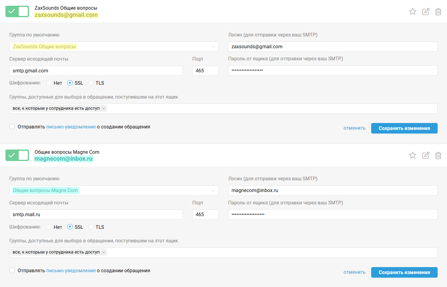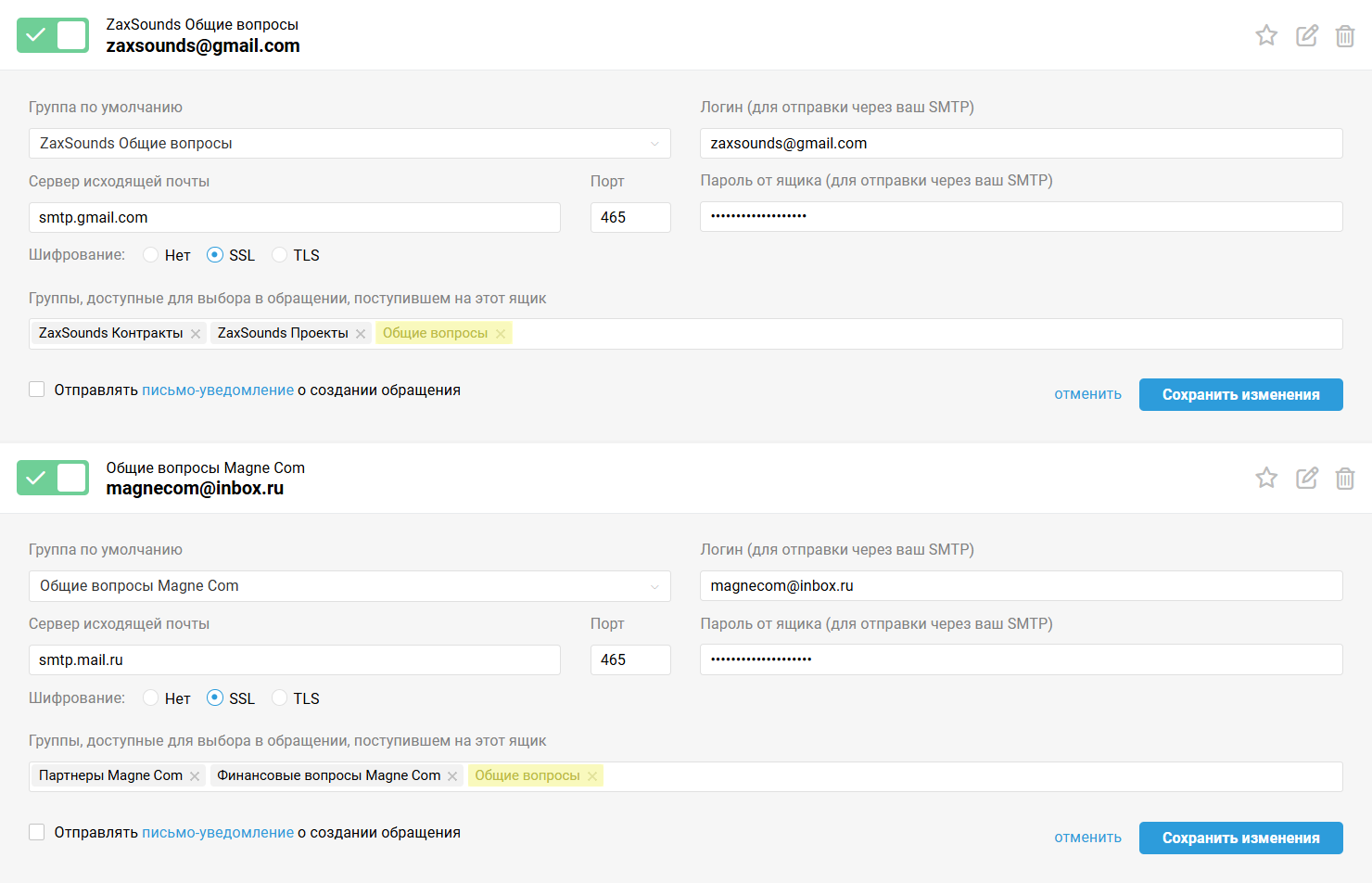 3. Когда в настройках ящиков указаны определённые группы, мы всегда проверяем соответствие выставленных ящика и группы на странице обращения и на странице создания обращения.