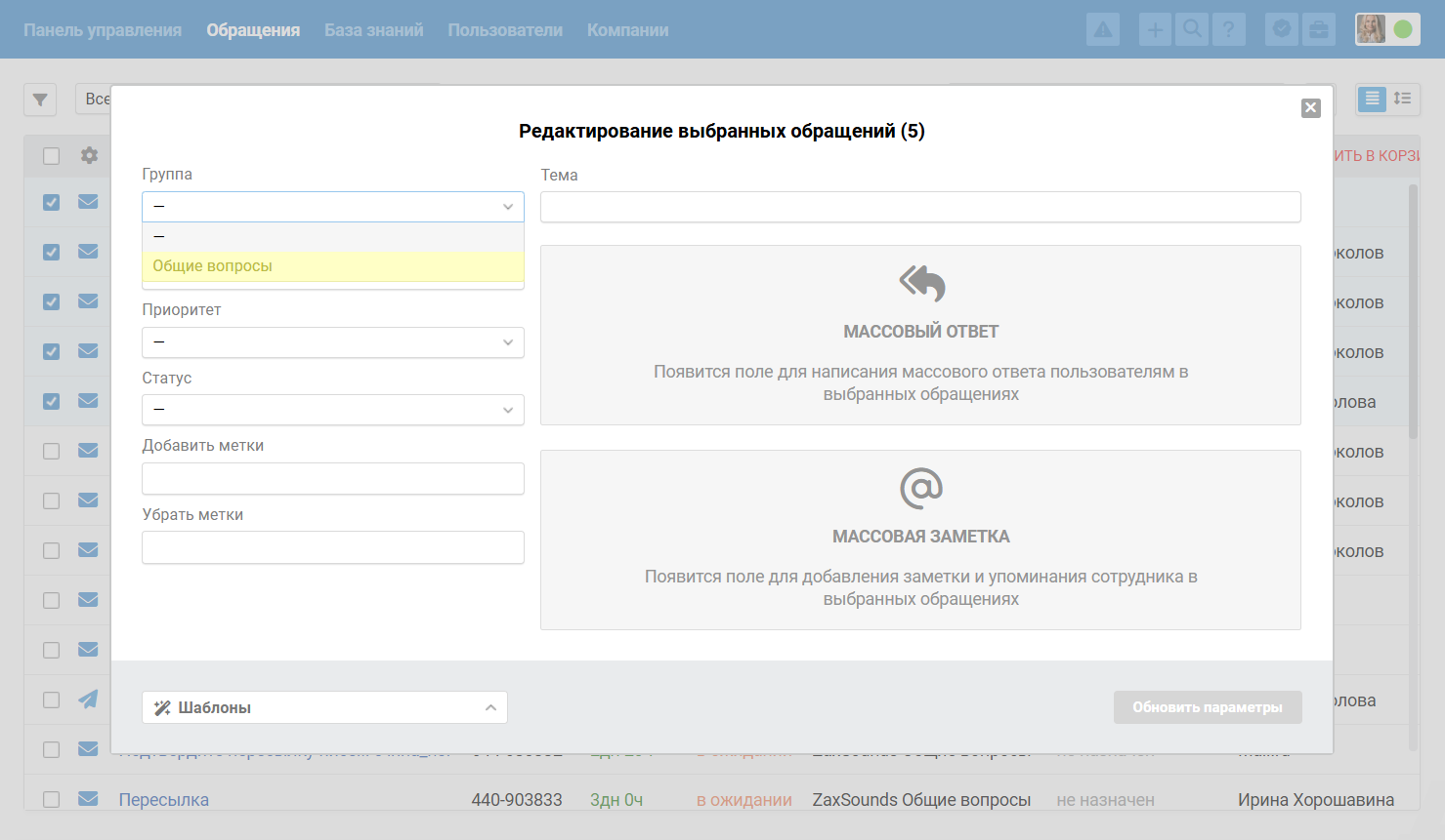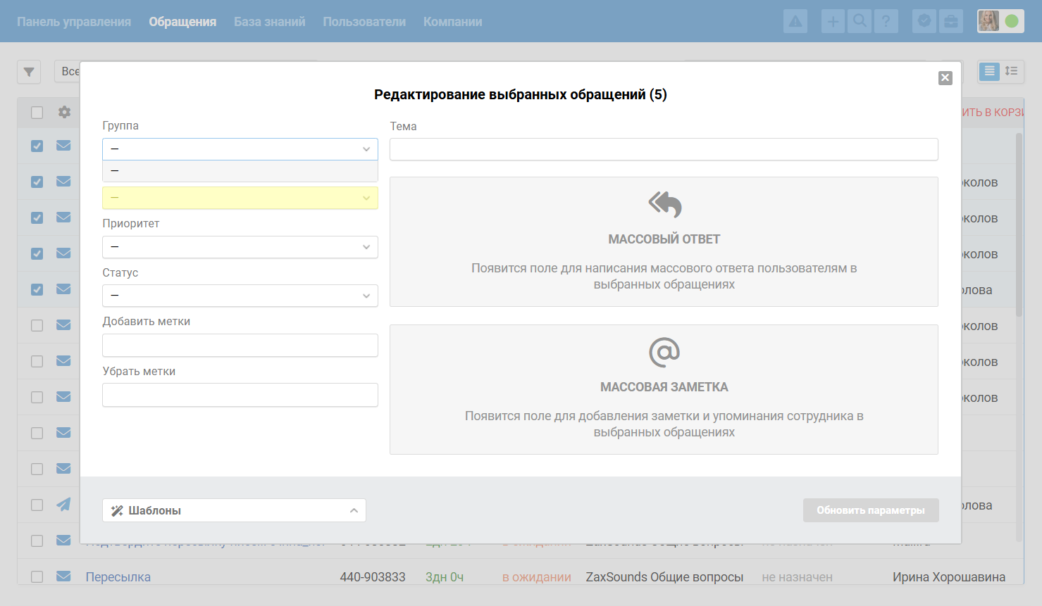 4. Если сотрудник попытается сменить группу через массовые действия в общем списке обращений, то список групп будет зависеть от того, какие ящики выставлены в поле «Отвечать с адреса» у выбранных обращений.