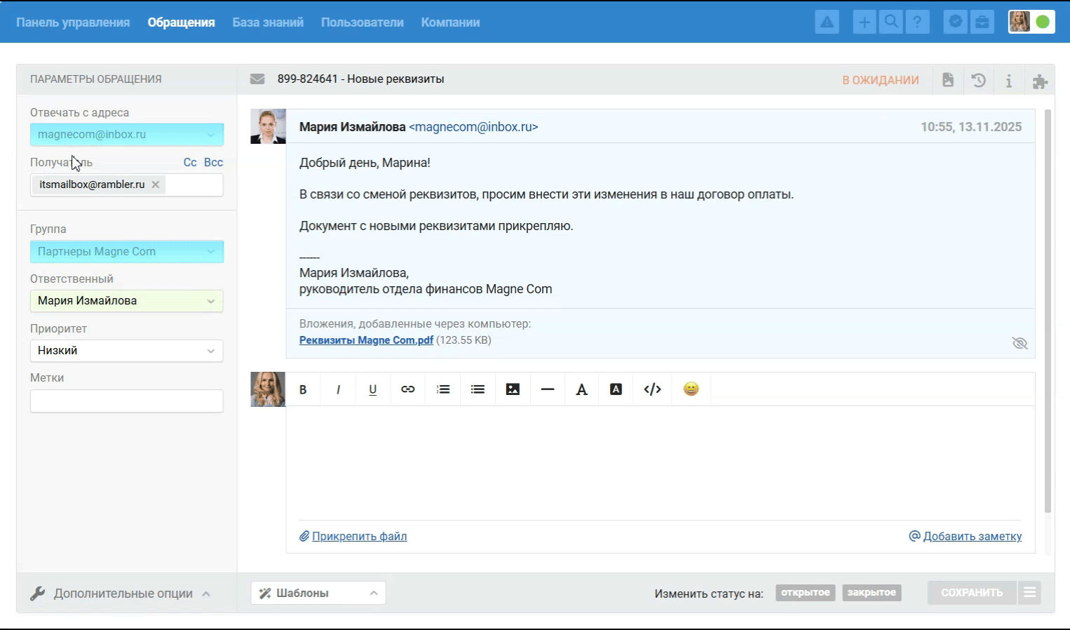 Если у сотрудника нет доступа к группам, которые указаны в настройках ящика, то он не увидит этот ящик ни на странице обращения, ни при создании обращения.