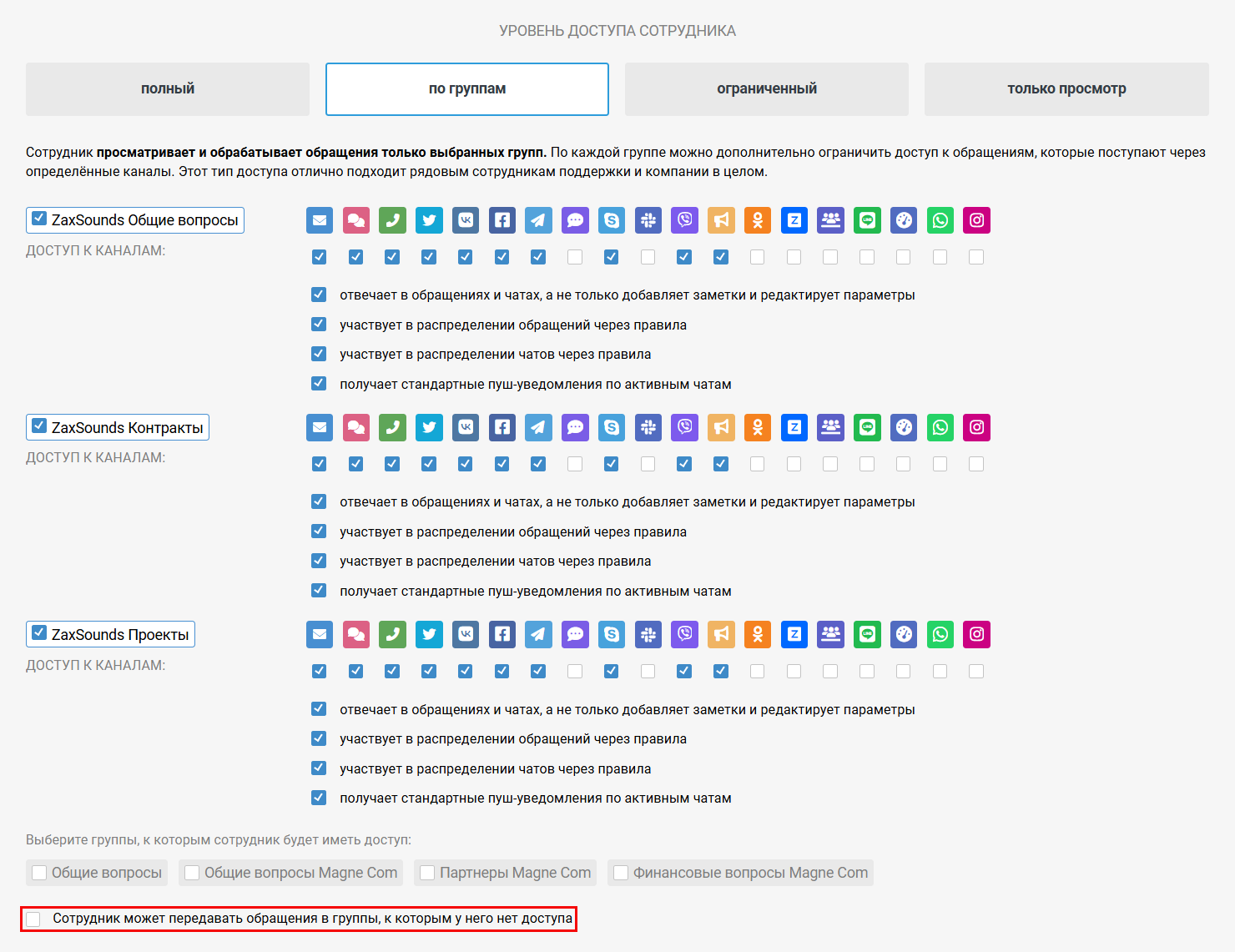б) если он НЕ отмечен, то в списке групп в обращении сотрудник видит только те, к которым у него есть доступ.