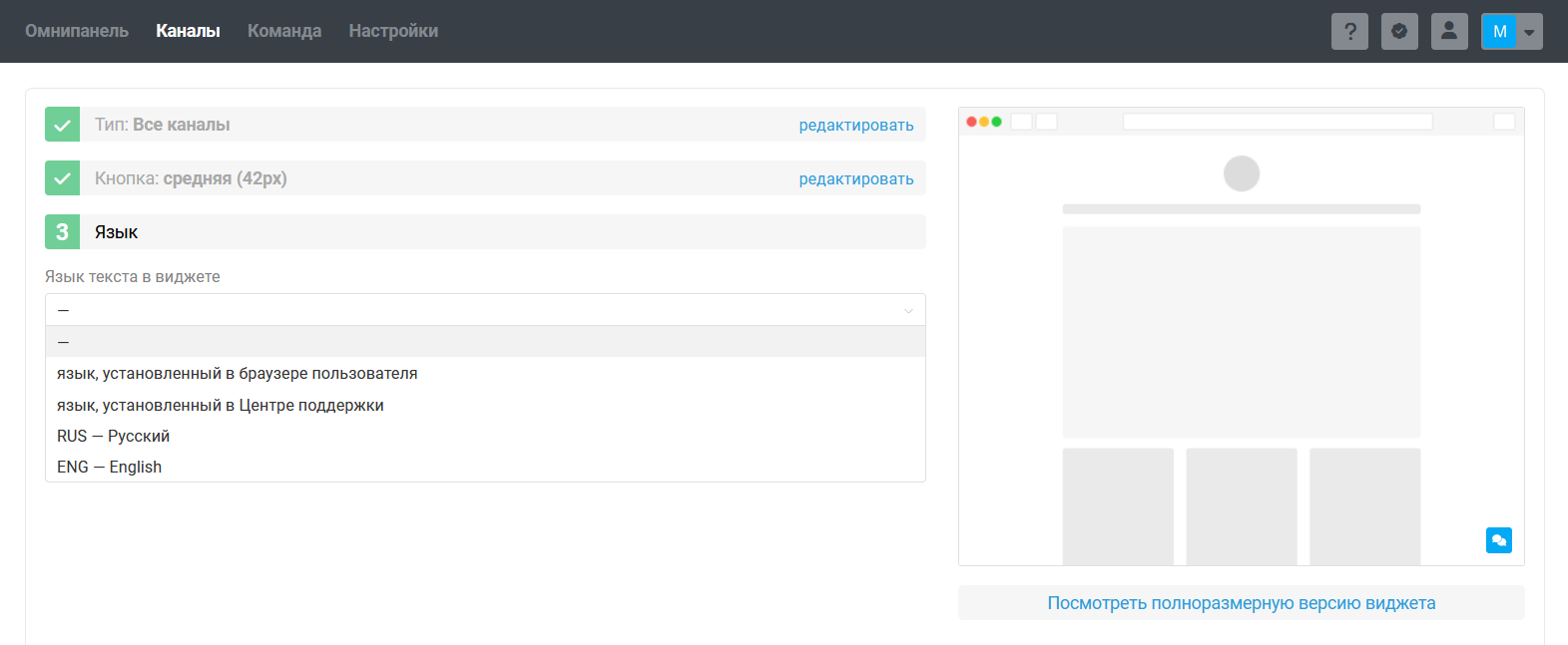 1. Если в Омнидеске добавлено несколько языков, то при создании любого типа виджета появится пункт для выбора языка, на котором будет отображаться виджет.