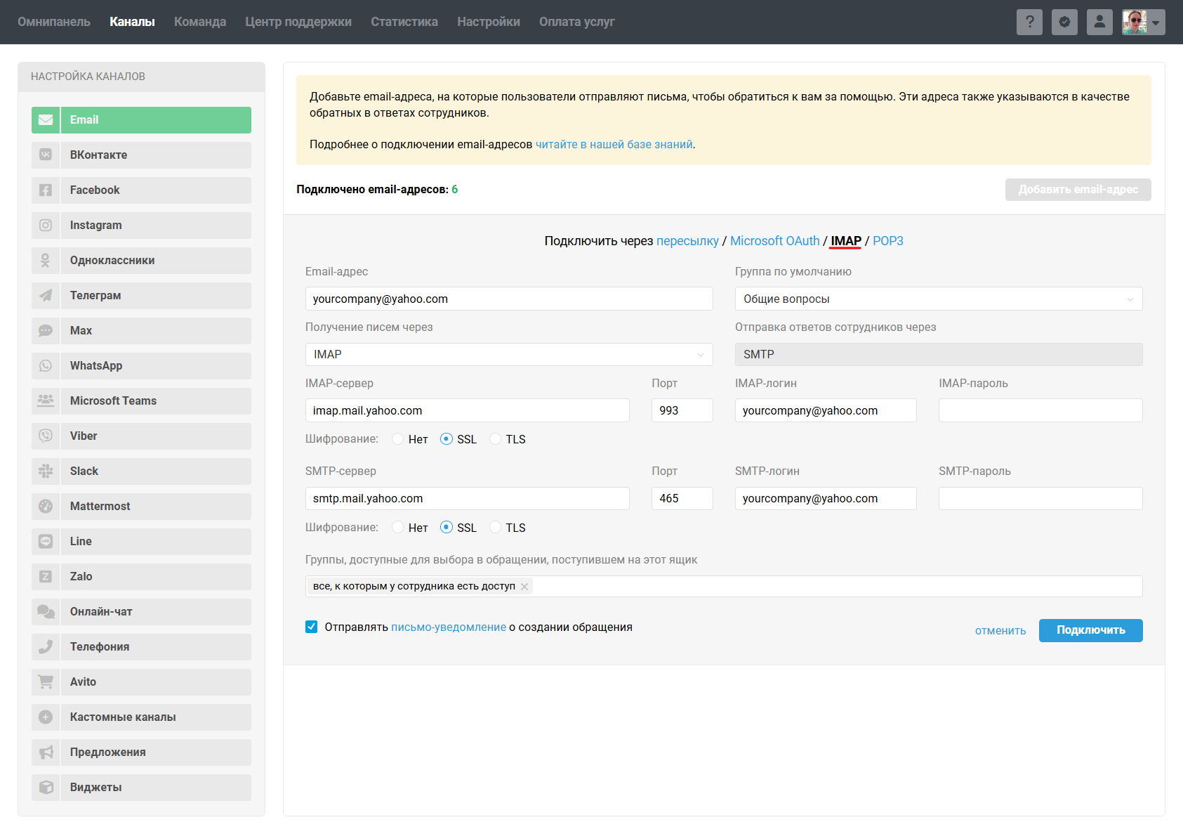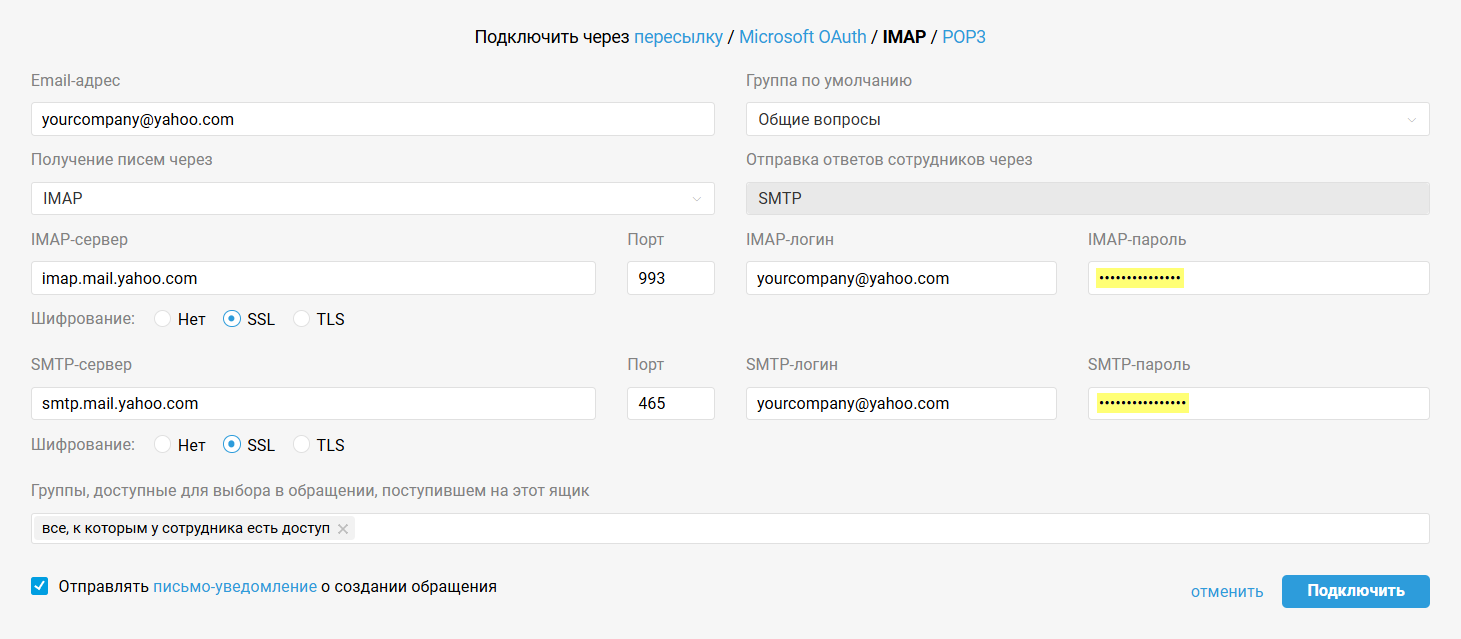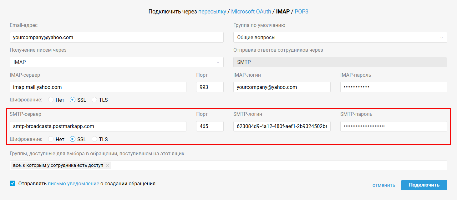 3. Вернитесь в Омнидеск, вставьте полученный на предыдущем шаге пароль в поля IMAP / SMTP-пароль и нажмите «Подключить».