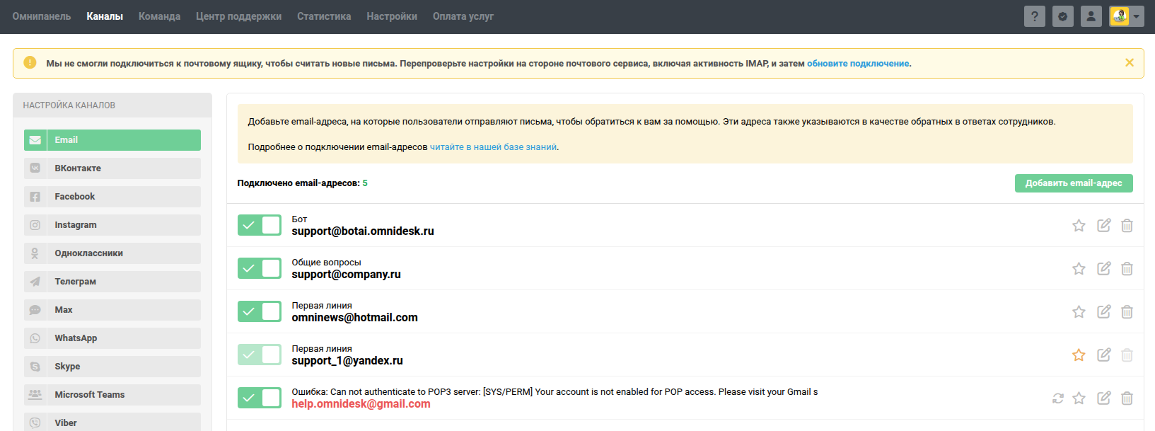 Если при попытке подключения к ящику почтовый сервер отвечает ошибкой, мы выводим уведомление в шапке аккаунтов сотрудника и администратора, а в списке подключенных ящиков-каналов выделяем проблемный адрес красным.