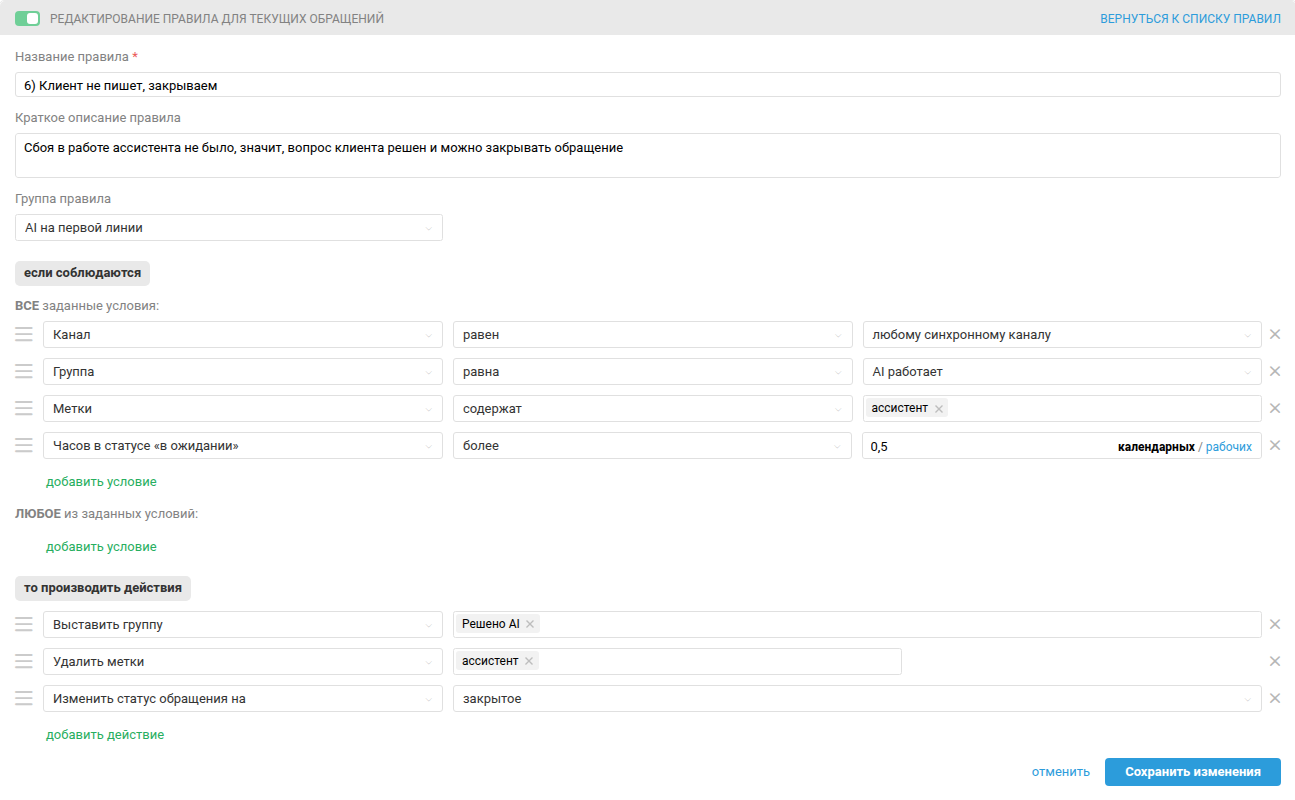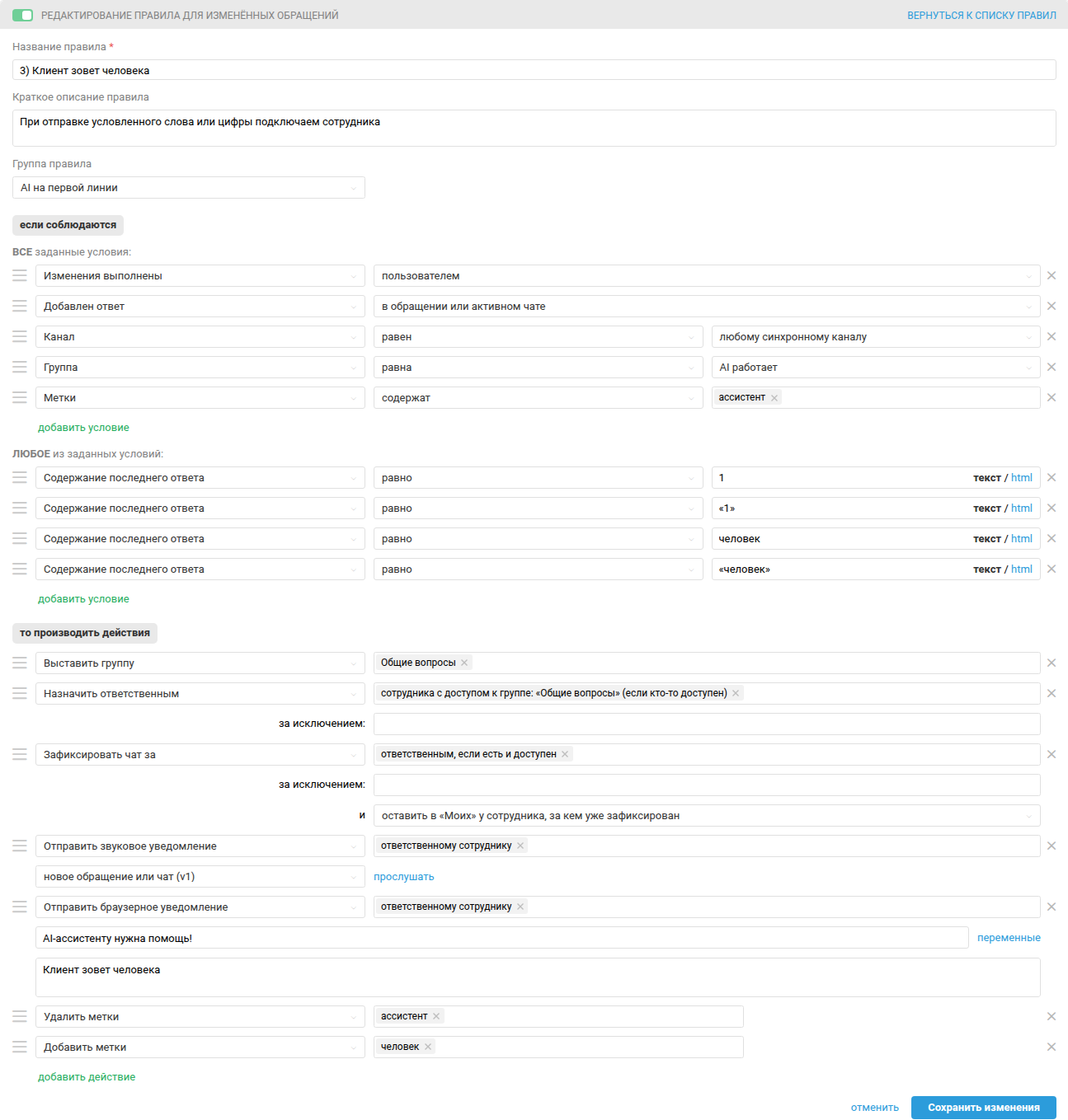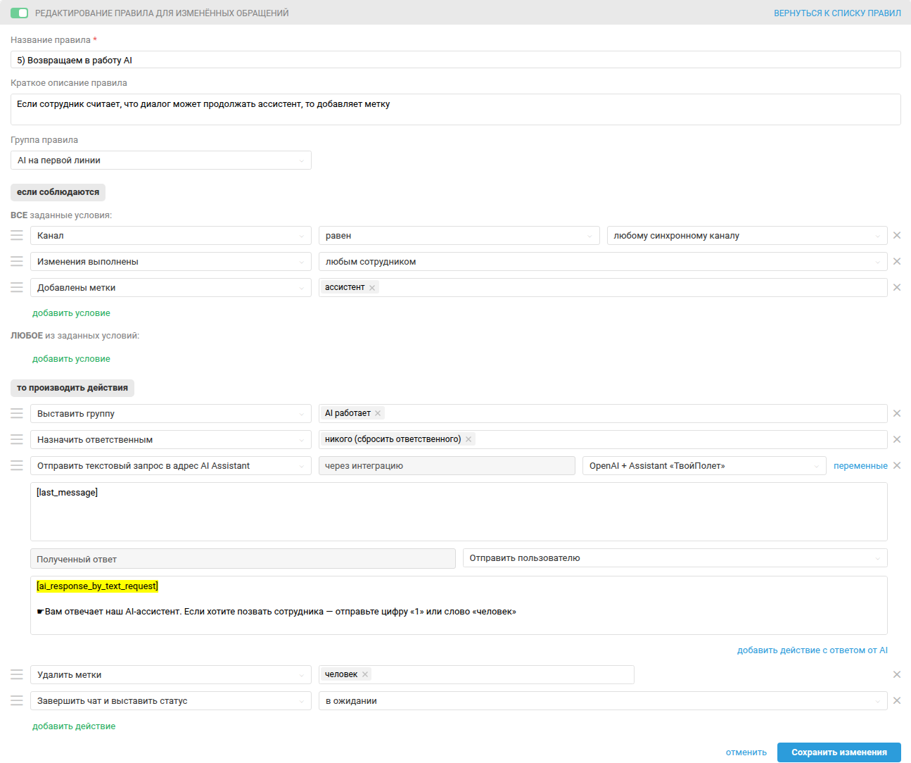 5) Правило для измененных возвращает обращение в работу ассистенту в ситуациях, когда сотрудник считает, что диалог может продолжить AI. Чтобы ассистент снова подключился, сотруднику нужно вернуть в обращение метку «ассистент».