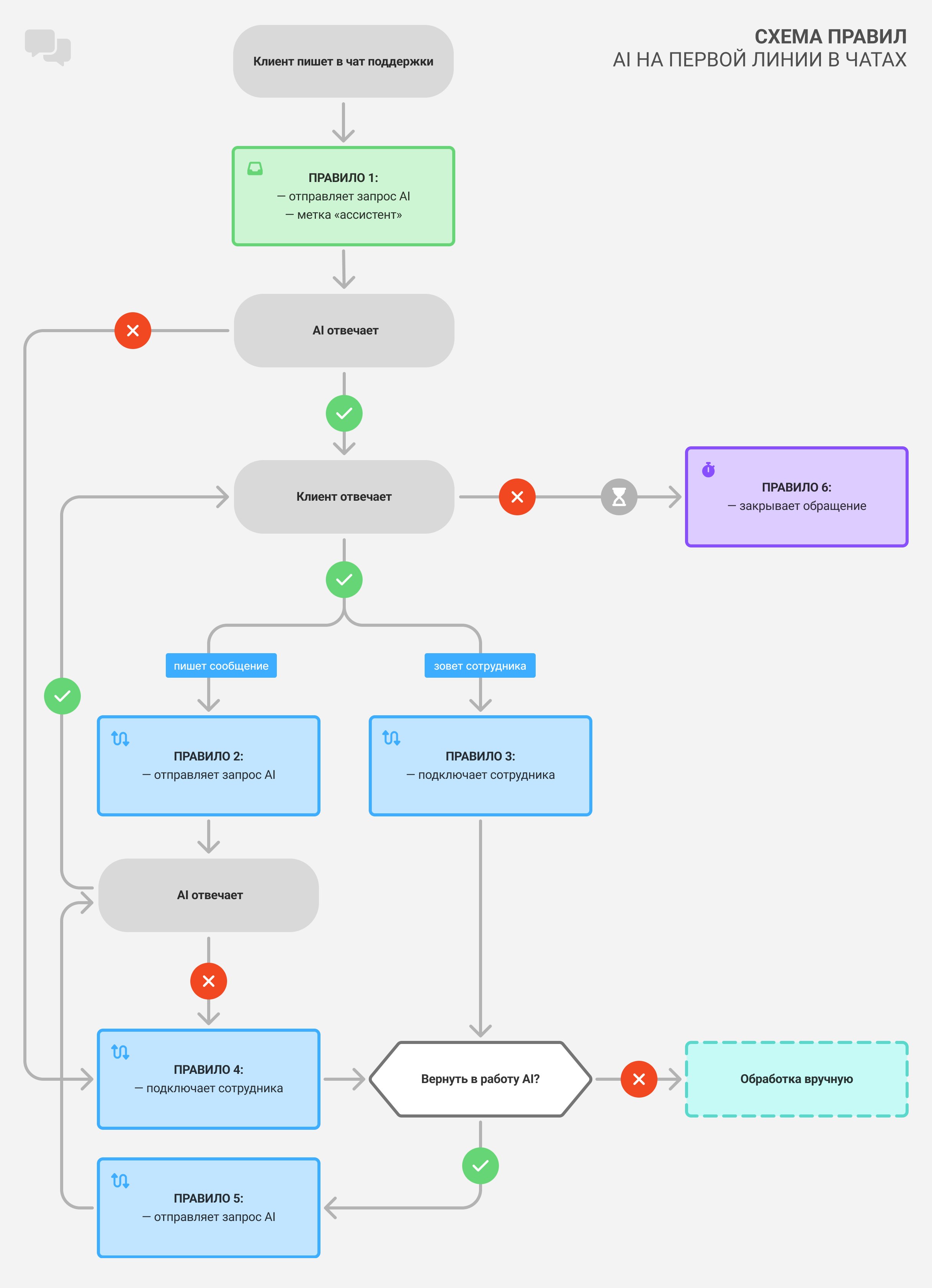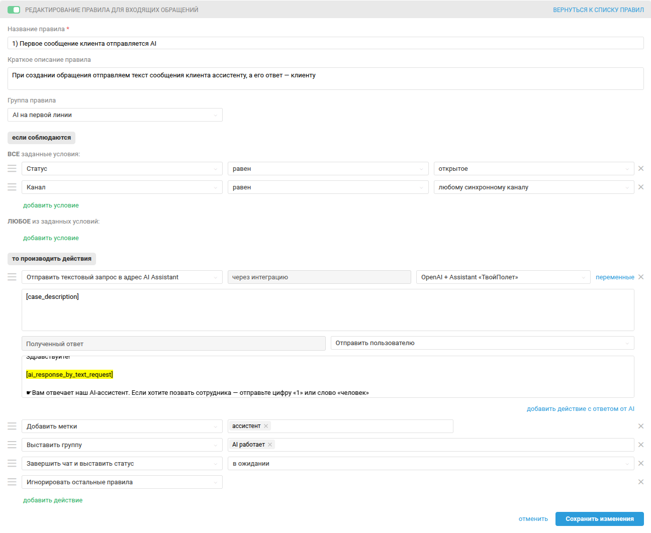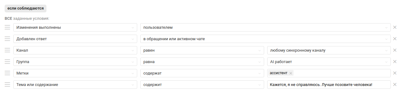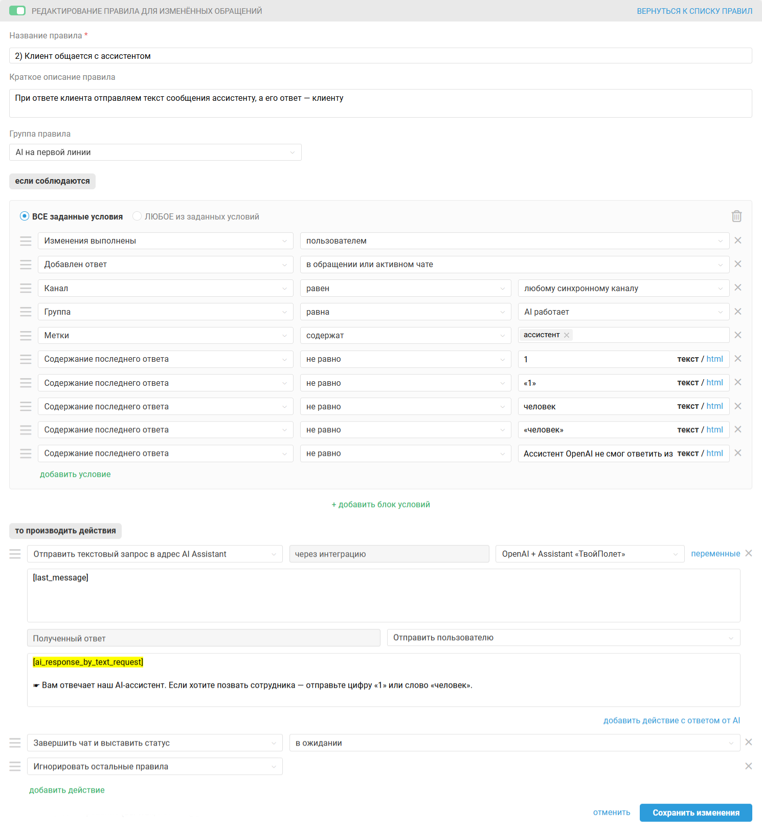 5) Правило для измененных возвращает обращение в работу ассистенту в ситуациях, когда сотрудник считает, что диалог может продолжить AI. Чтобы ассистент снова подключился, сотруднику нужно вернуть в обращение метку «ассистент».