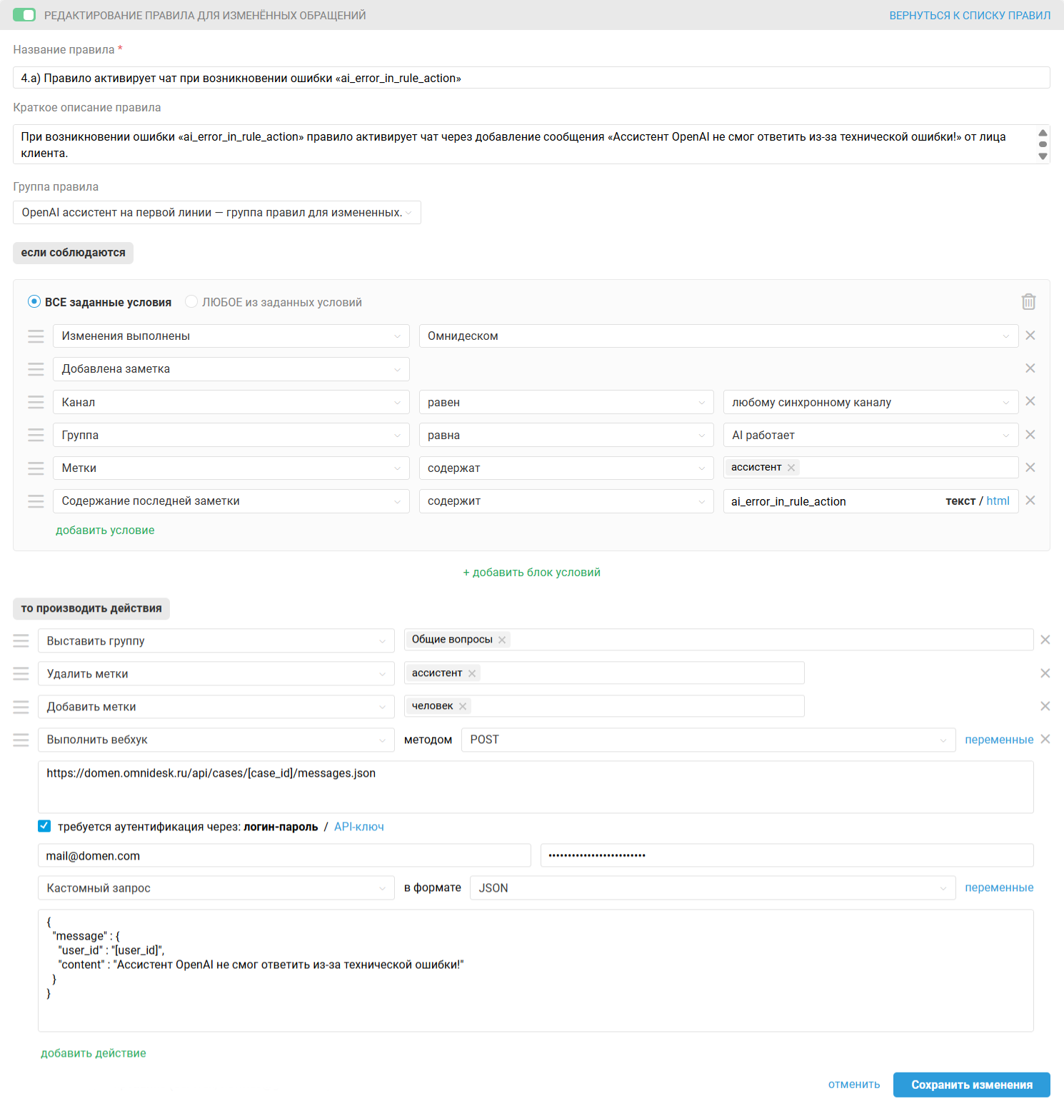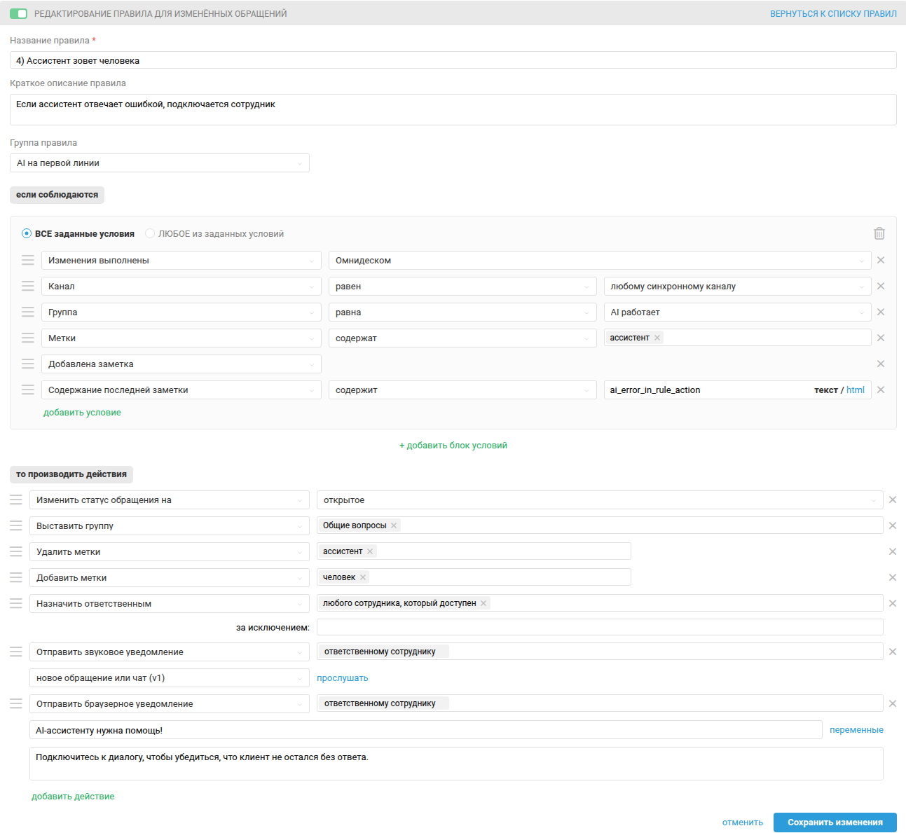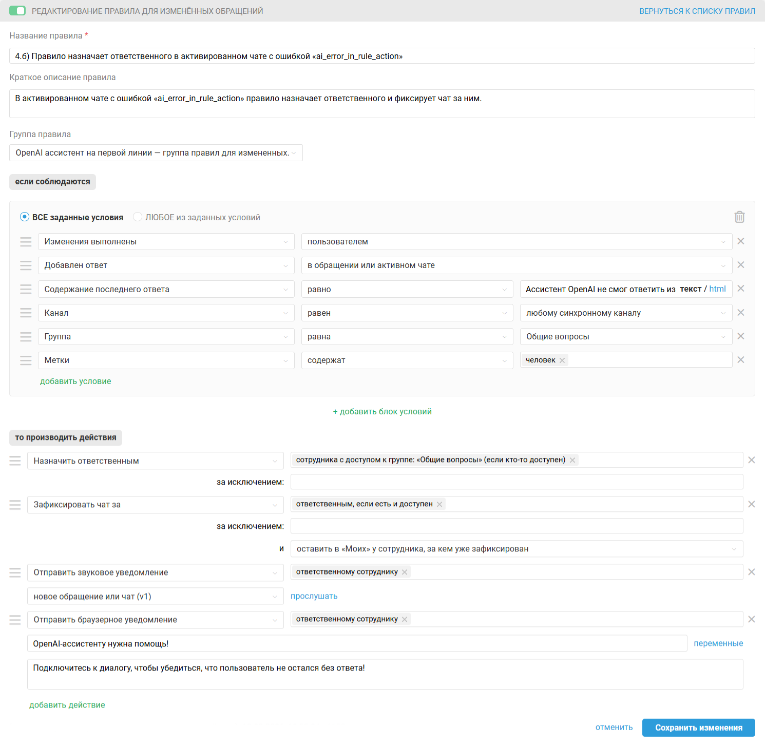 4) Правило для измененных подключает сотрудника, если вместо ответа ассистент отвечает ошибкой.