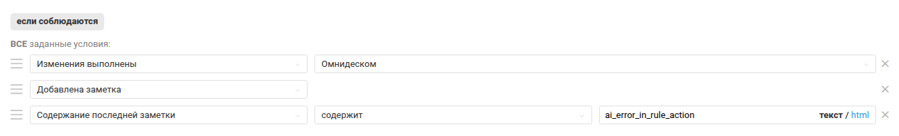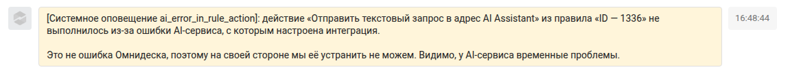 В некоторых случаях AI-ассистент может ответить ошибкой. При этом все остальные действия правил, отправляющих запрос в его адрес, выполняются — в том числе и выставление в обращении статуса «в ожидании». В таких ситуациях Омнидеск добавляет в обращение системную заметку и неудаляемую метку ai_error_in_rule_action: