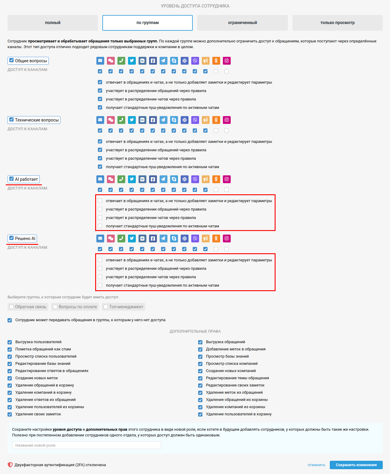 Правила, которые будут передавать сообщения клиента ассистенту, выставляют в обращении статус «в ожидании», так что отвлекать сотрудников они не будут. Но при желании можете полностью закрыть сотрудникам доступ к группам «AI работает» и «Решено АI» или настроить доступ к ним только в режиме просмотра.