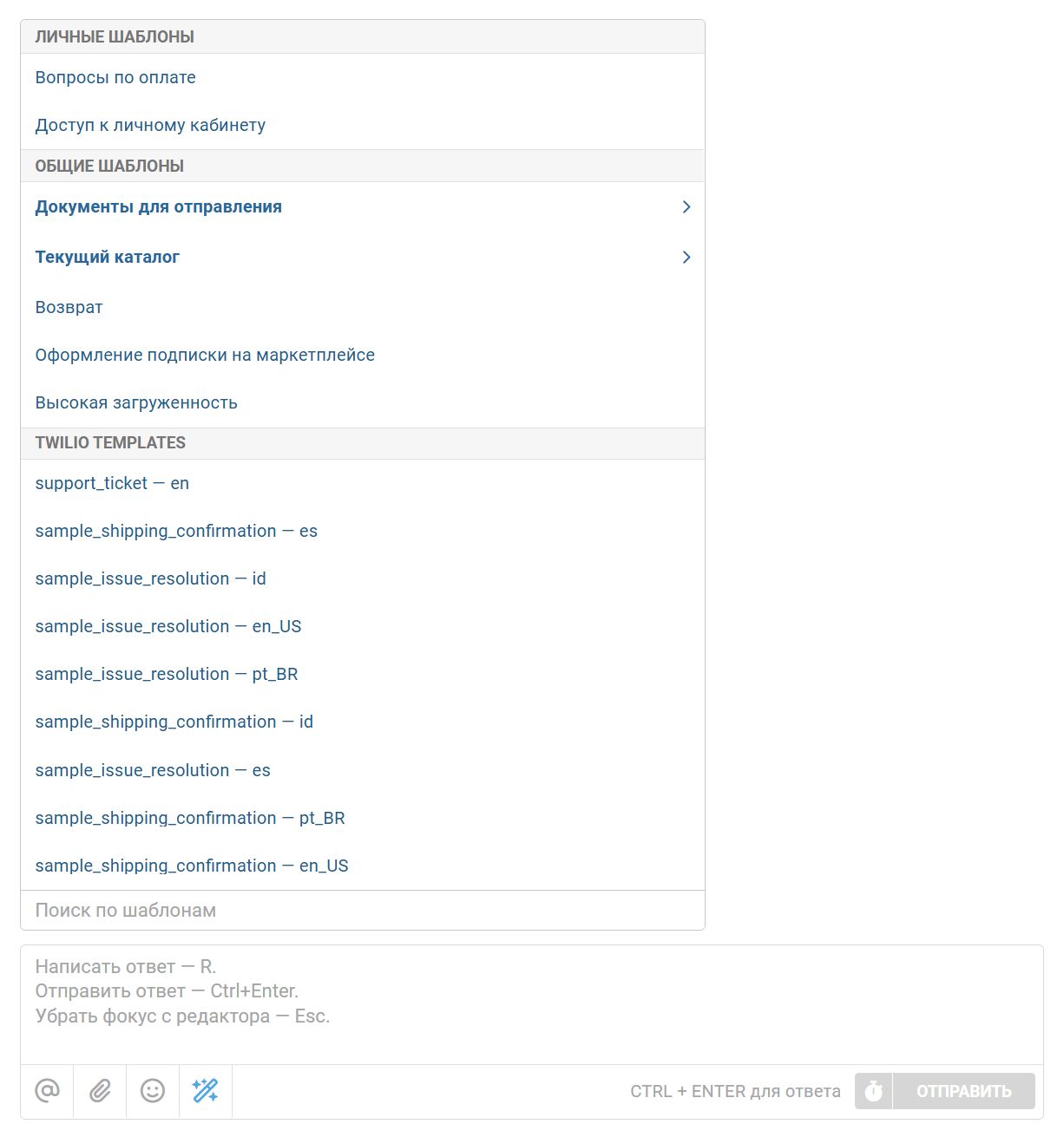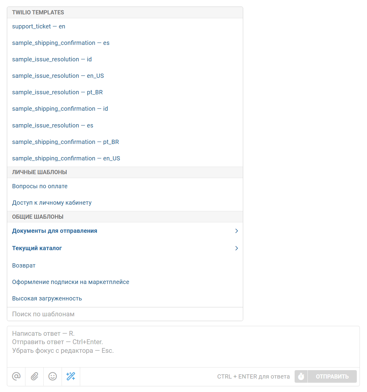 - Шаблоны подгружаются, только если вы находитесь на странице WhatsApp-обращения – в остальных каналах они не отвлекают сотрудников;