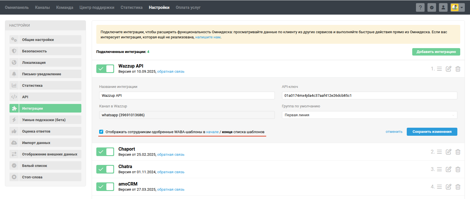 При подключении интеграции вы можете отметить опцию «Отображать одобренные WABA-шаблоны» и выбрать, где их выводить — в конце списка, после общих и личных шаблонов сотрудников, или на самом верху.