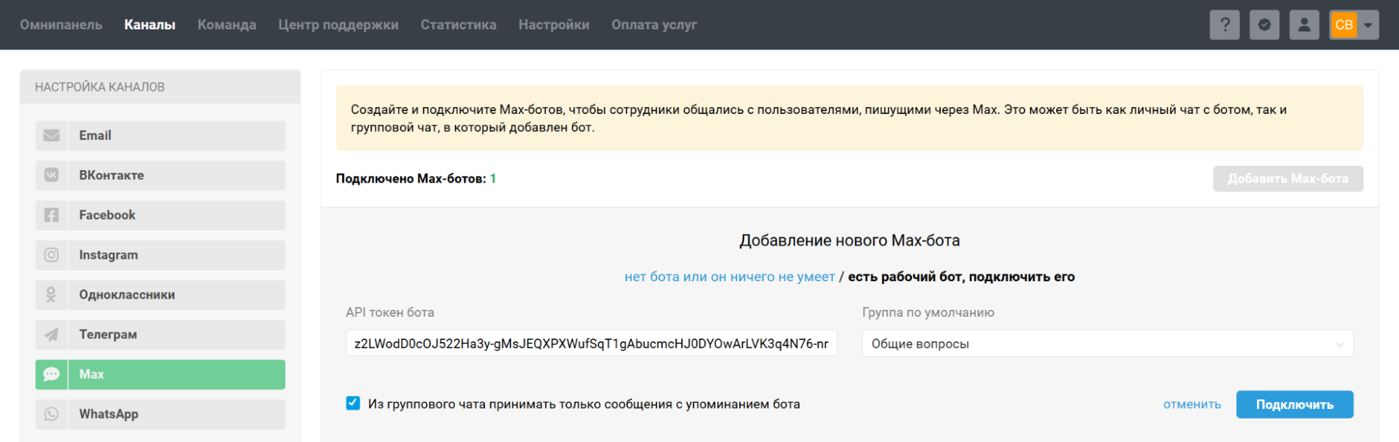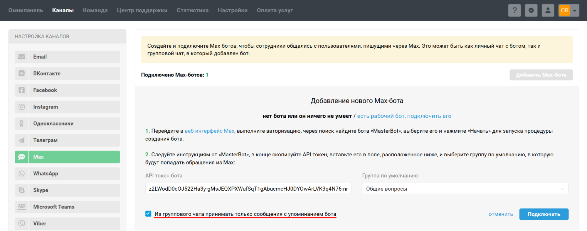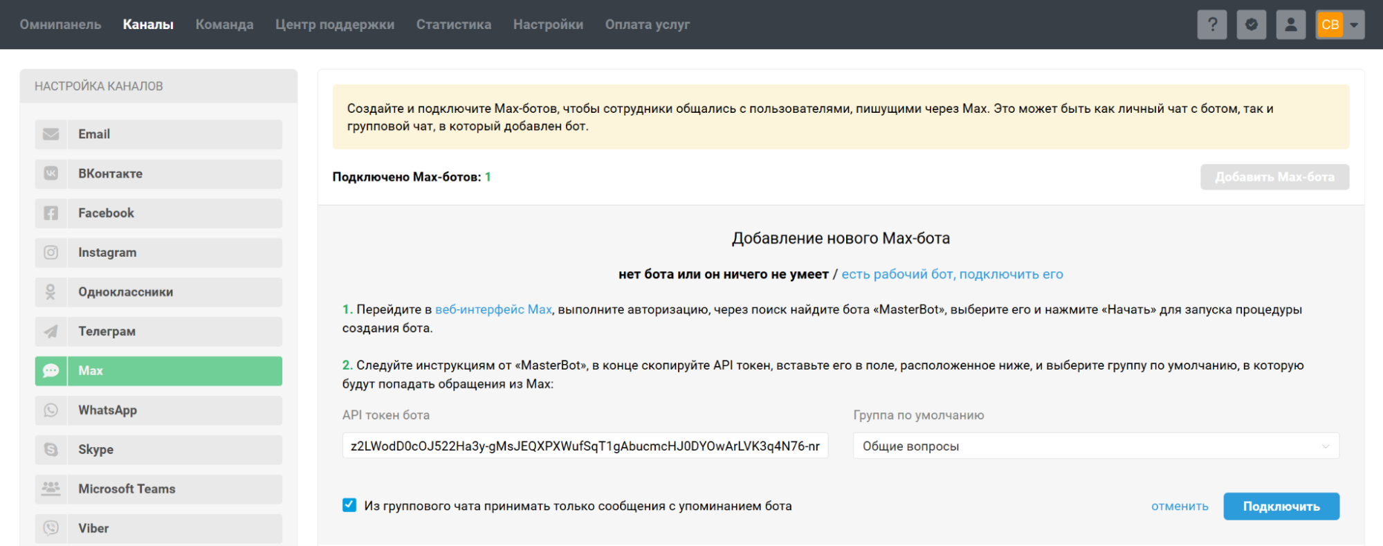 В форме подключения и редактирования Max-бота вы можете выбрать, какие сообщения будут поступать в Омнидеск из групповых чатов, в которые добавлен бот: