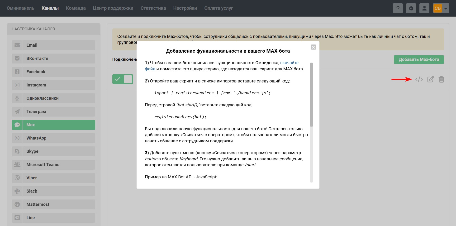 Мессенджер Max подключается к Омнидеску через бота, в адрес которого ваши клиенты отправляют сообщения.