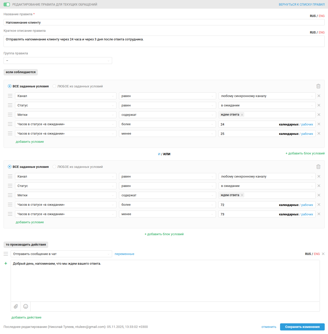 К примеру, можно в рамках одного правила настроить отправку напоминания клиенту, что мы ждем от него ответа, через разные промежутки времени: