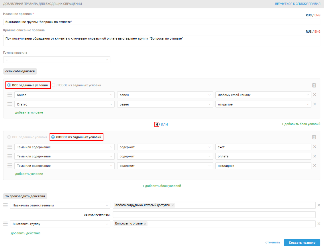 Если нужно было проверять несколько разных наборов условий в блоке «ЛЮБОЕ из заданных условий», приходилось создавать отдельные правила. Например, чтобы отправлять одинаковый автоответ клиентам в нерабочее время и в праздники, но только для обращений определенных групп, требовалось два отдельных правила.