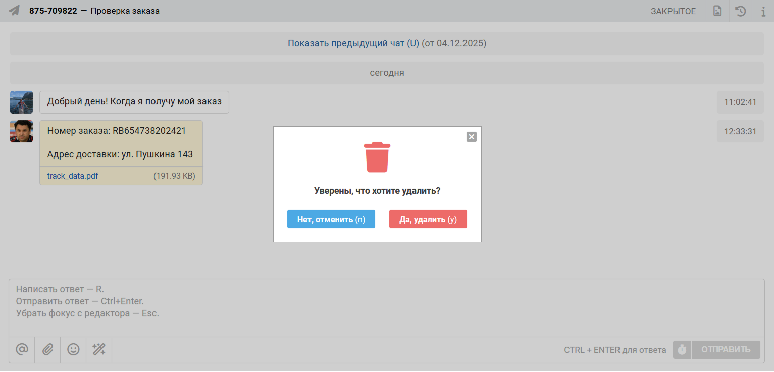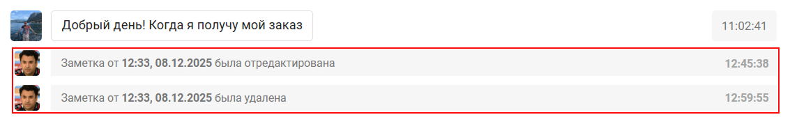 После подтверждения удаления заметка будет удалена, а в историю действий в обращении добавится запись «Заметка от [дата, время] была удалена» от имени сотрудника, который выполнил изменения.