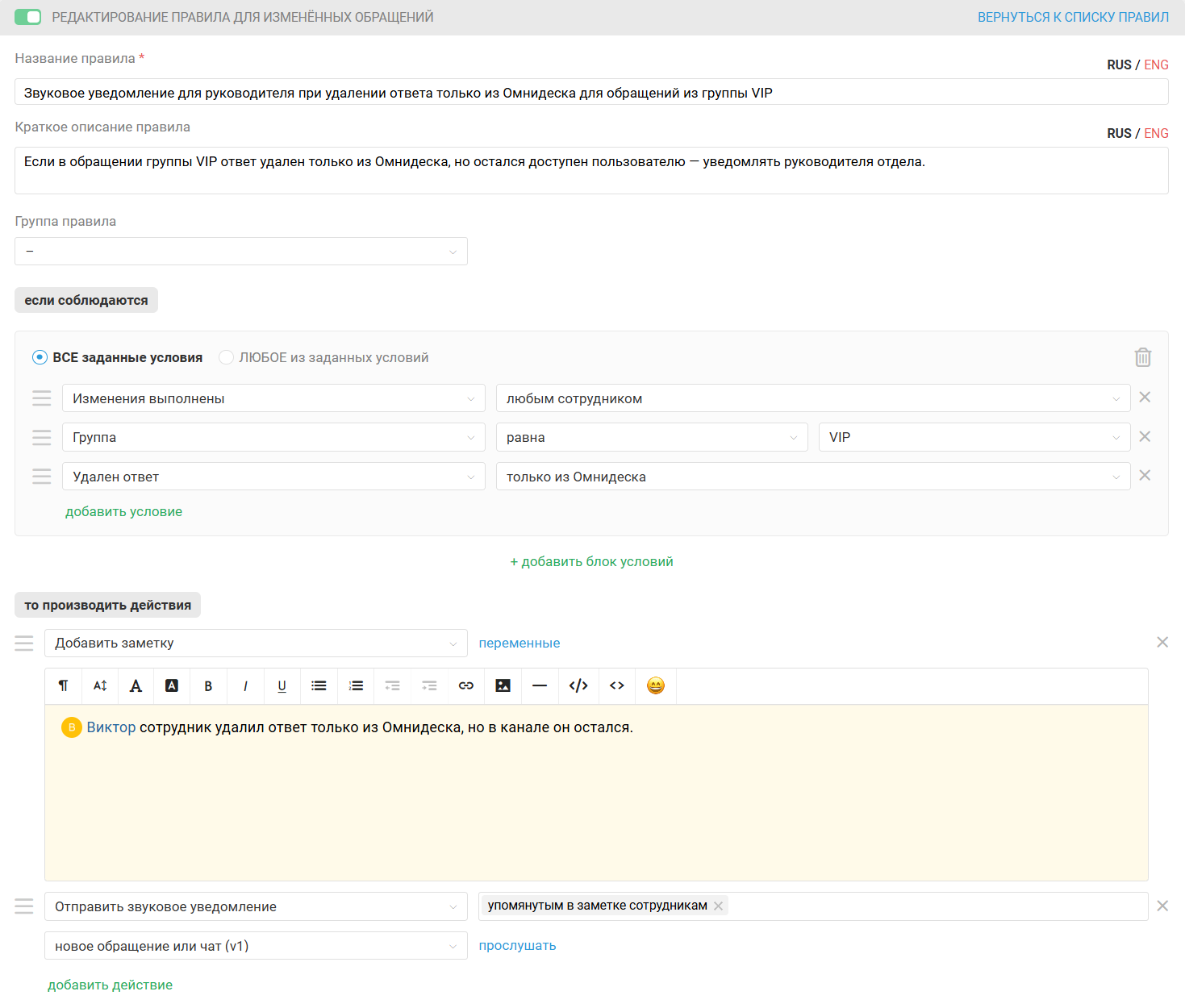 К примеру, вы можете настроить правило для уведомления руководства о ситуациях, когда сотрудник удалил сообщение из Омнидеска, но клиент продолжает его видеть на своей стороне: