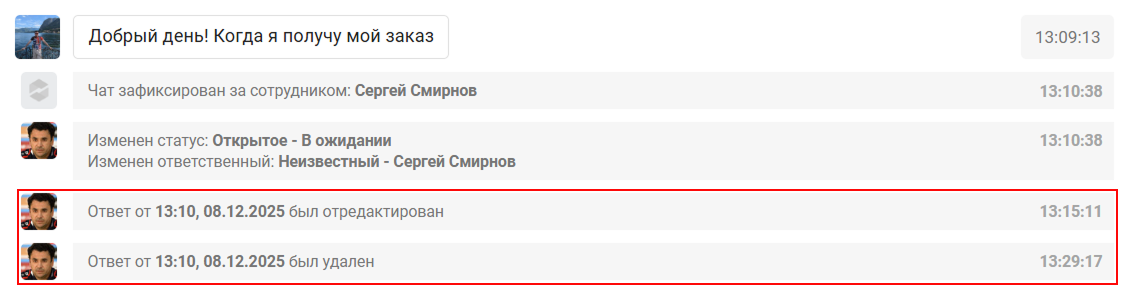 - в истории действий появится запись «Ответ от [дата, время] был отредактирован / удален» от имени сотрудника, который выполнил изменения;