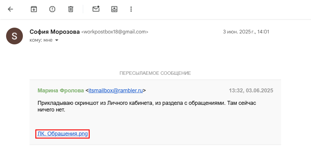 - Если в обращении есть прикрепленные файлы, то при пересылке ссылки на них добавляются в соответствующем месте переписки.