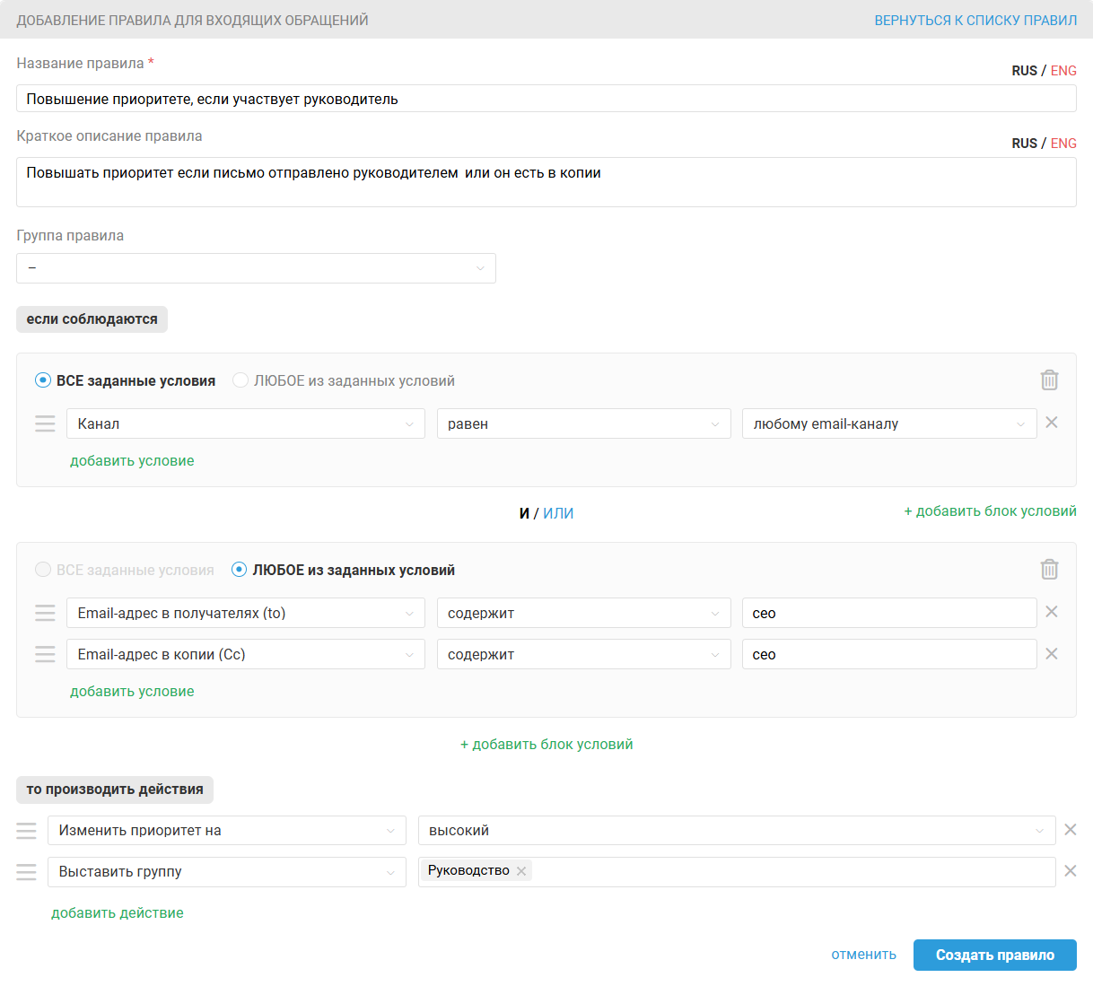 15. Во всех типах правил появились два новых действия: «Добавить в копию» и «Добавить в скрытую копию» — на случай, если требуется добавить адреса в копии, когда обращение соответствует условиям правила.