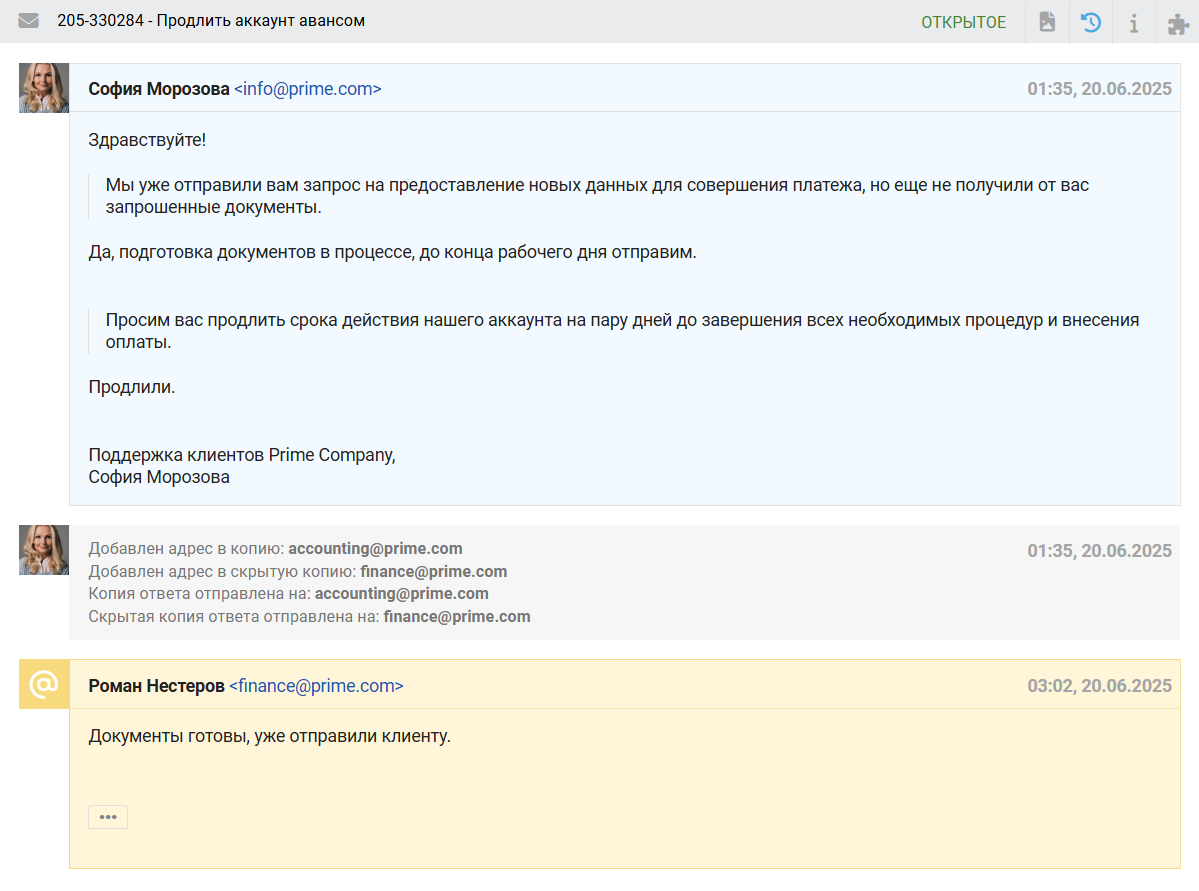 Иногда к переписке нужно подключить коллег — бухгалтера или разработчика, чтобы они были в курсе обсуждения, либо — незаметно для получателя — руководителя, чтобы он мог держать руку на пульсе. Для этого в канале «Почта» предусмотрены обычные и скрытые копии писем. Они позволяют добавлять дополнительные адреса, не нарушая структуру диалога и не создавая дубликатов обращений.