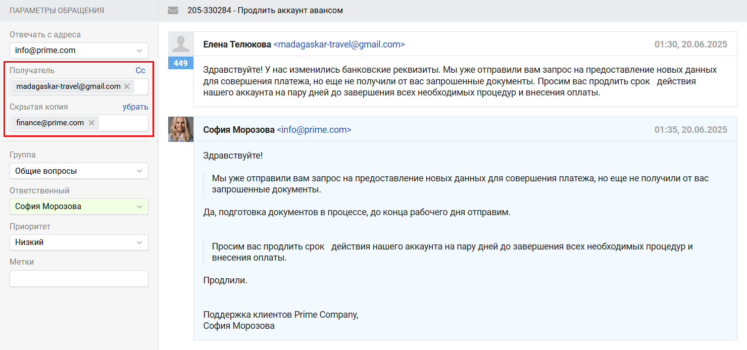 10. Поддержка копий работает и в обратном направлении. Если пользователь отправляет запрос (или новый ответ в текущую переписку) и добавляет другой адрес в Cc, мы автоматически прописываем этот адрес в поле «Копия», чтобы при ответе сотрудника письмо отправлялось на оба адреса.
